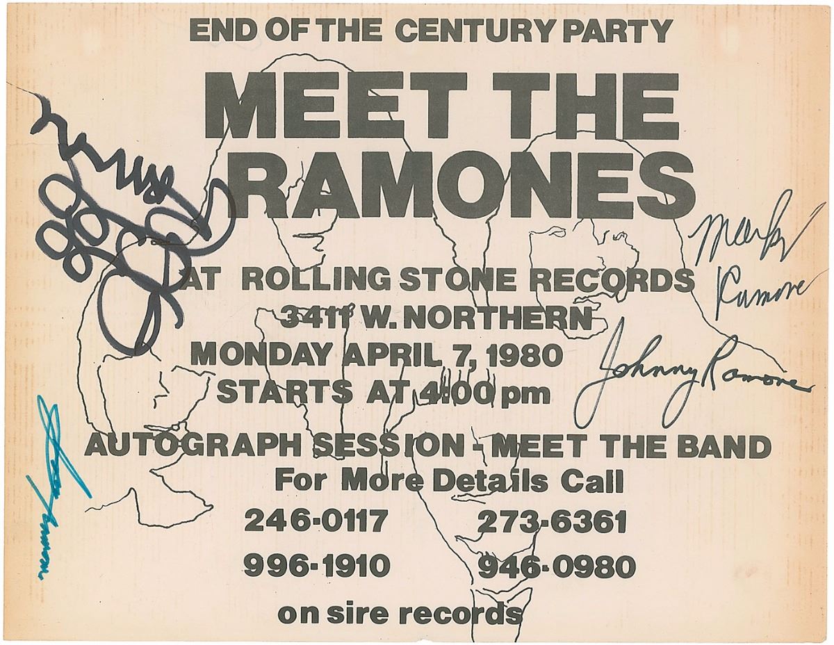 Flyer for a Meet the Ramones End of the Century Party and autograph session, 11 x 8.5, April 7, 1980. Signed in black felt tip by Johnny Ramone, Marky Ramone, and Dee Dee Ramone, and in blue felt tip by Joey Ramone. Intersecting folds, mild overall toning (heaviest to edges), and a tear to the left edge that slightly affects the Dee Dee autograph, otherwise fine condition.