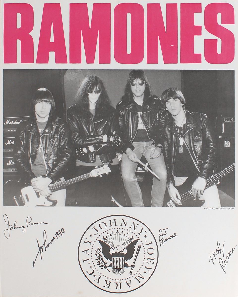 Color 22 x 28 poster showing an image of the Ramones posing in their trademark black leather, with the band’s presidential seal below, signed in the lower border in black felt tip by Johnny, CJ, Marky, and Joey Ramone, who adds “1990.” Mounted to a same-size sheet of foam core and in fine condition, with a central vertical and horizontal fold as issued. Oversized.