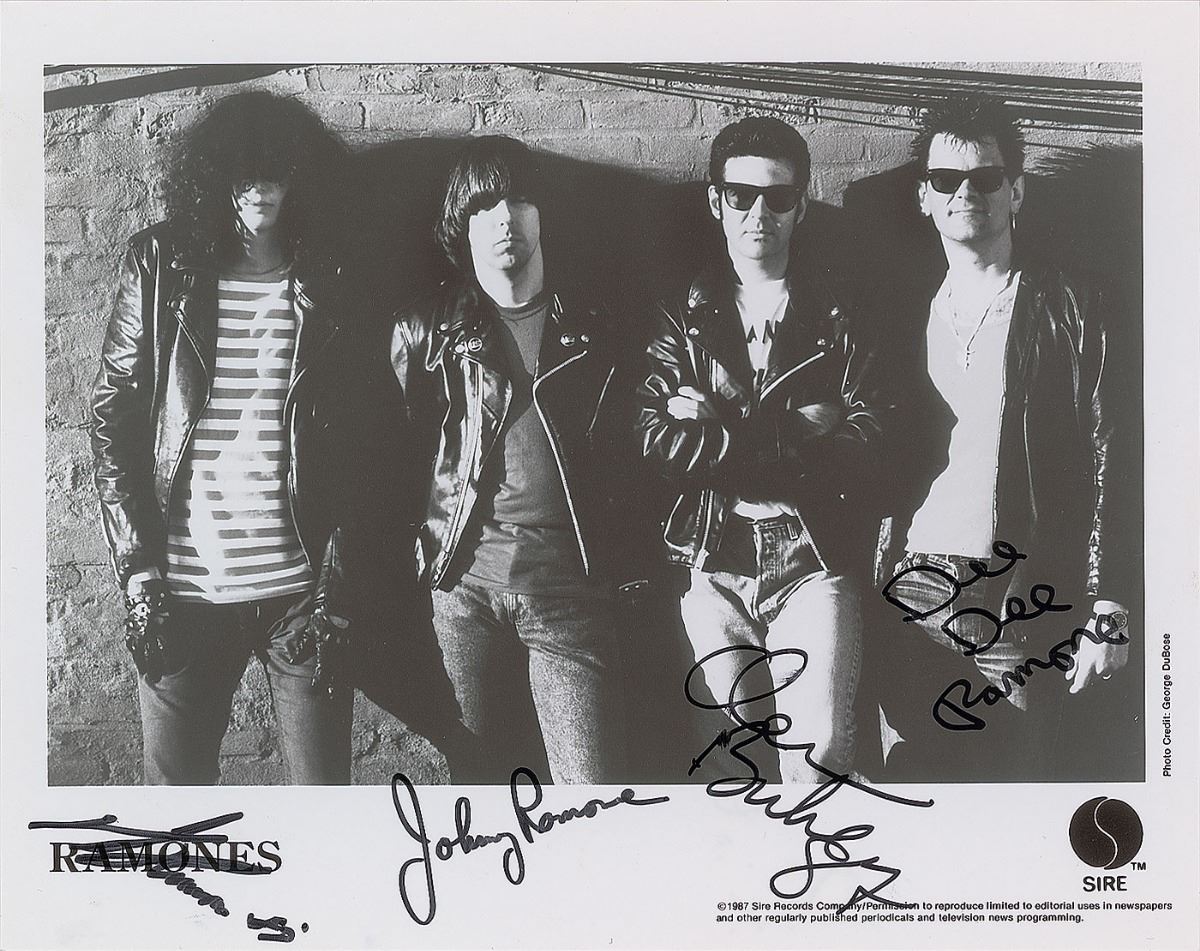 Rare semi-glossy 10 x 8 Sire Records publicity group photo of The Ramones, signed in black felt tip by Johnny, Dee Dee, and Joey Ramone, and Clem Burke, the latter two adding “87.” In fine condition. Burke joined The Ramones for two shows under the stage name Elvis Ramone following Richie Ramone’s sudden departure in late August of 1987. A desirable and uncommon lineup of the leather-clad punk rockers.