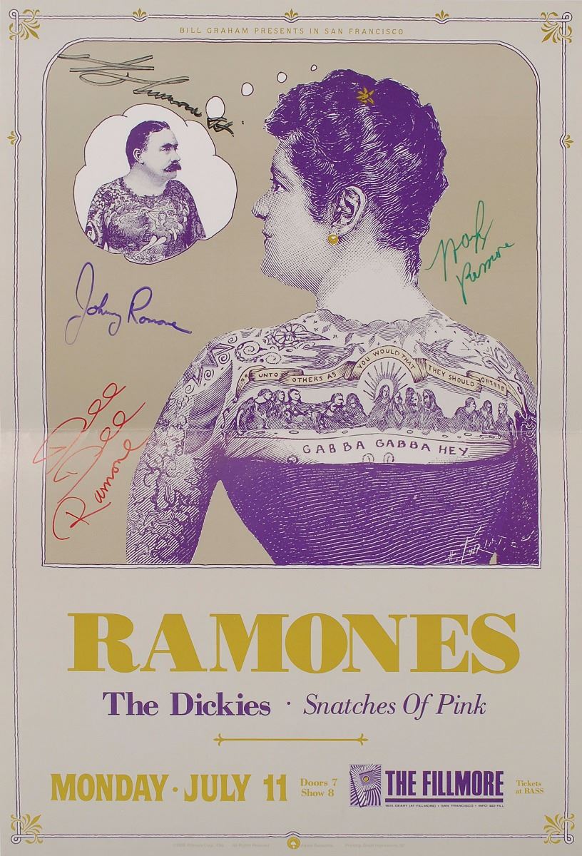 Attractive color Arlene Owseichik promotional poster for a Ramones concert held at The Fillmore in San Francisco on June 11, [1988], 12.75 x 19.25, signed in various colored felt tip by Joey, Johnny, Dee Dee, and Marky Ramone. The poster features a tattooed woman daydreaming about a tattooed man, her back reading, “Gabba Gabba Hey,” with The Dickies and Snatches of Pink listed as supporting acts below. In fine condition, with a central horizontal fold.