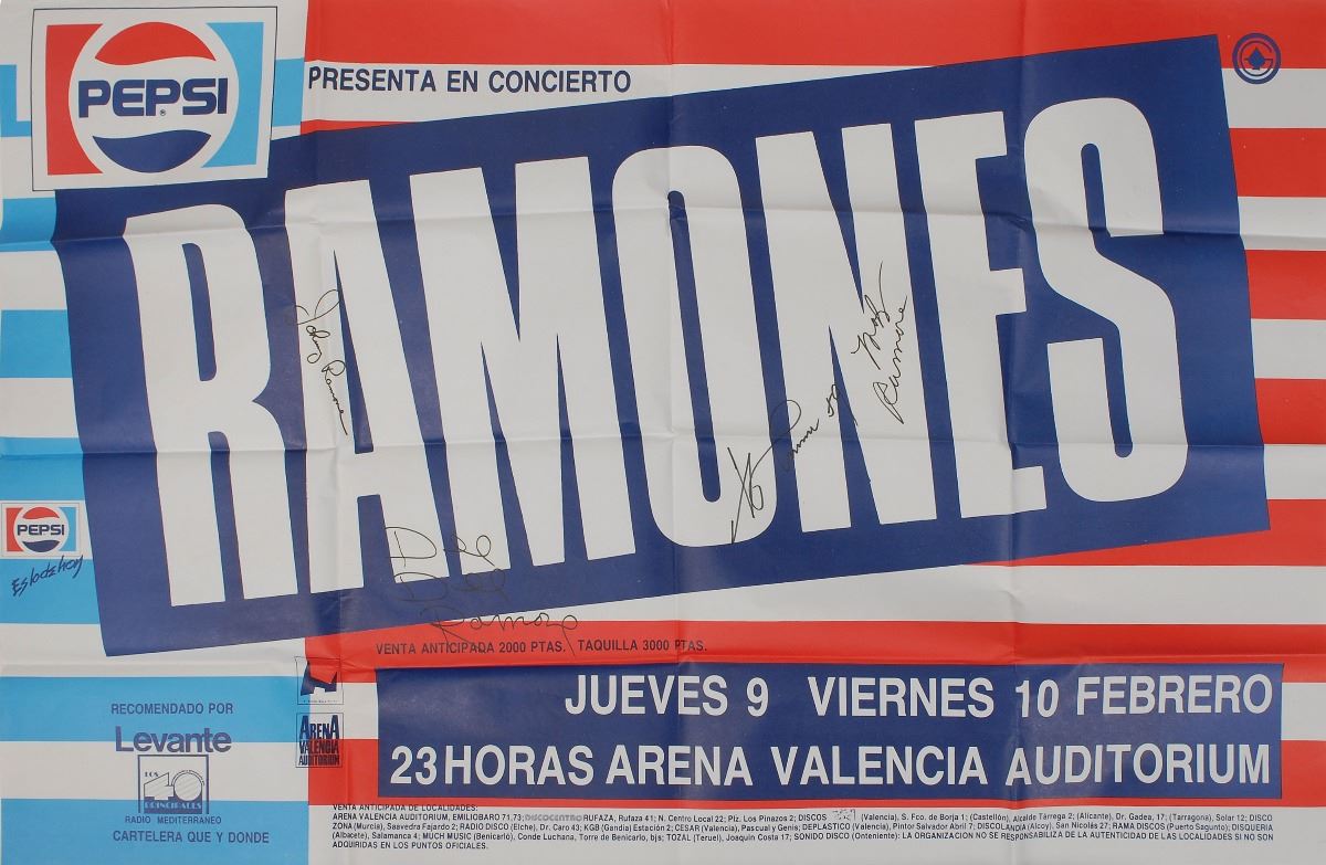 Massive red, white, and blue 50.5 x 33 concert poster for two Ramones shows at Spain’s Valencia Auditorium on February 9 and 10, 1989, signed in black felt tip by Johnny, Marky, Dee Dee, and Joey Ramone, who adds “89.” In fine condition, with some haloing to signatures and expected storage folds.