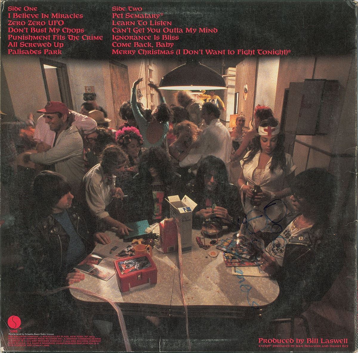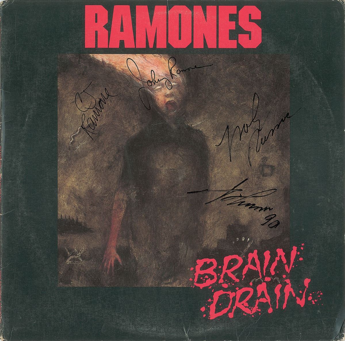 Brain Drain album signed on the front cover in black felt tip by CJ, Marky, Johnny, and Joey Ramone, who adds "90." Also signed on the back cover in blue felt tip by Dee Dee Ramone. In very good to fine condition, with light scuffing and creasing. The record is not included.