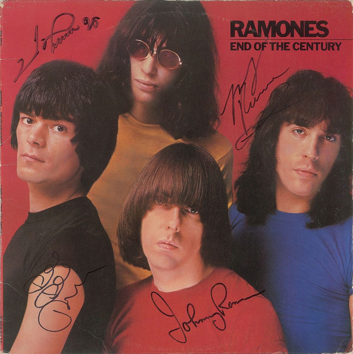 End of the Century album signed on the front cover in black felt tip by Johnny, Dee Dee, Marky, and Joey Ramone, who adds "96." In fine condition, with light scuffing and perimeter creasing. The record is not included.