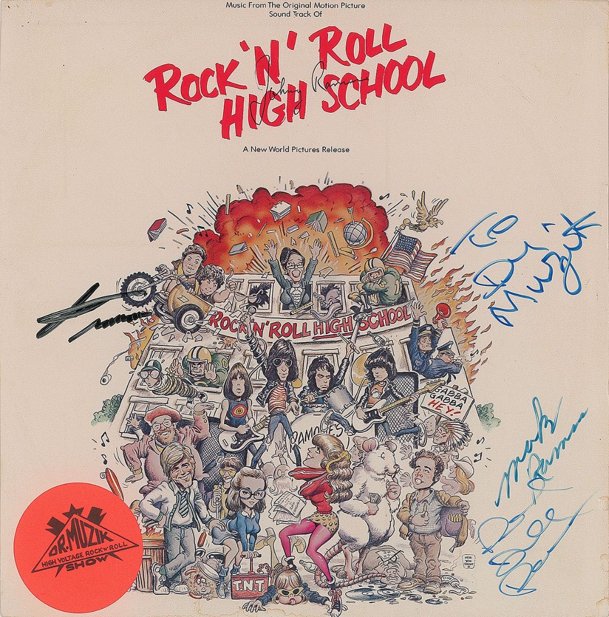 Rock 'N' Roll High School album flat signed and inscribed on the front cover in blue felt tip, "To Dr. Muzik, Dee Dee Ramone" and "Marky Ramone," in black felt tip, "Joey Ramone," and in black ballpoint, "Johnny Ramone." In fine condition. The record is not included.