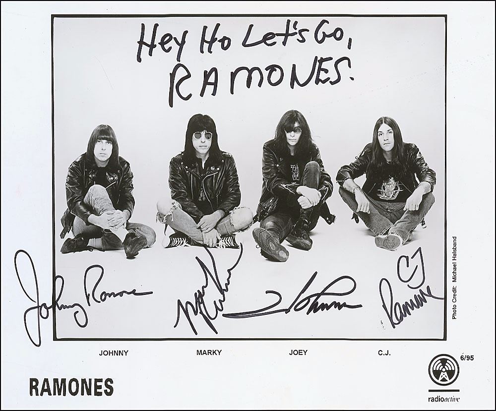 Choice glossy 10 x 8 Radioactive promotional photo of the band, signed in black felt tip by Johnny, Marky, Joey, and C. J. Ramone, with "Hey Ho Let's Go, The Ramones!," added at the top by Marky Ramone. In fine condition.