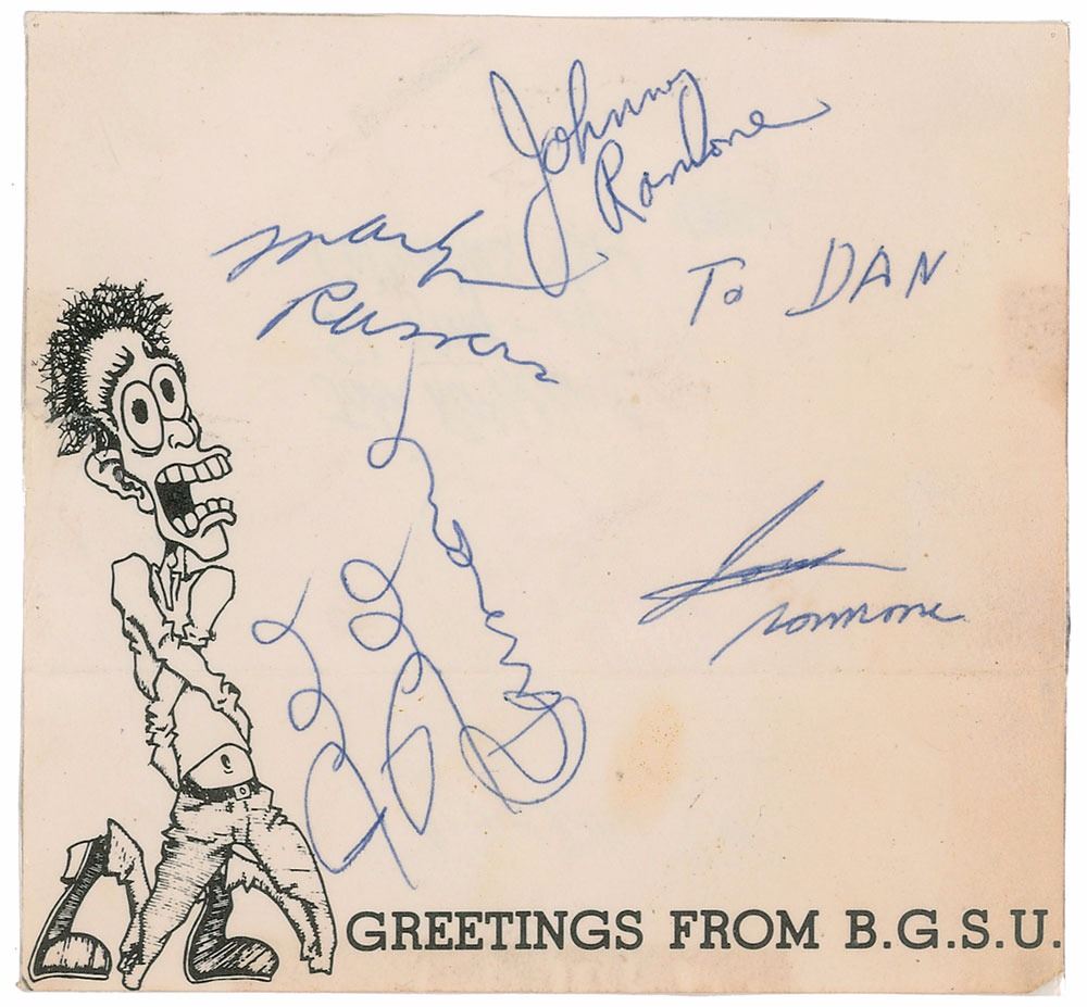 Uncommon "Greetings from B.G.S.U." custom mailing envelope, 5.5 x 5, signed and inscribed in blue ballpoint, "To Dan, Joey Ramone," "Johnny Ramone," "Marky Ramone," and "Dee Dee Ramone." Reverse bears a postmark dated October 8, 1979. In fine condition, with trimmed edges and light soiling.