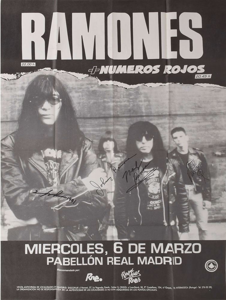 Large 34 x 48 poster for a Ramones concert at the Pabellon in Madrid, Spain, on March 6, 1991, signed in black felt tip by Johnny, Marky, CJ (who adds a stick figure), and Joey Ramone, who adds "1991." The poster displays a huge image of the band and lists the supporting act as Numerous Rojos. In fine, folded condition.