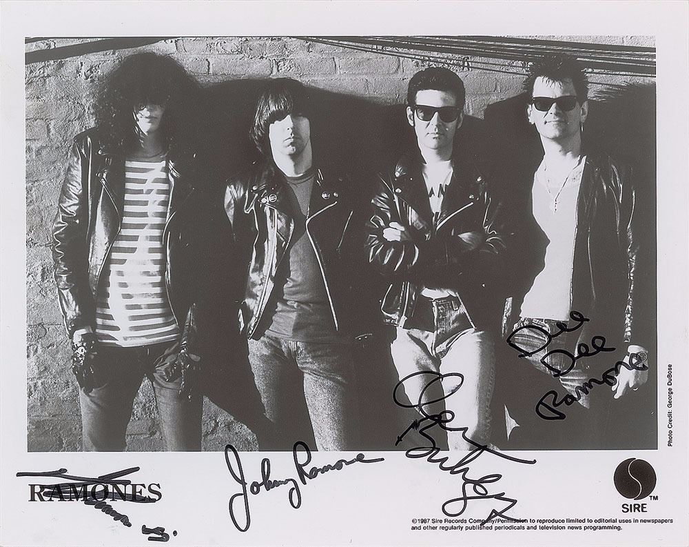 Rare semi-glossy 10 x 8 Sire Records publicity group photo of The Ramones, signed in black felt tip by Johnny, Dee Dee, and Joey Ramone, and Clem Burke, the latter two adding "87." In fine condition. Burke joined The Ramones for two shows under the stage name Elvis Ramone following Richie Ramone's sudden departure in late August of 1987. A desirable and uncommon lineup of the leather-clad punk rockers.