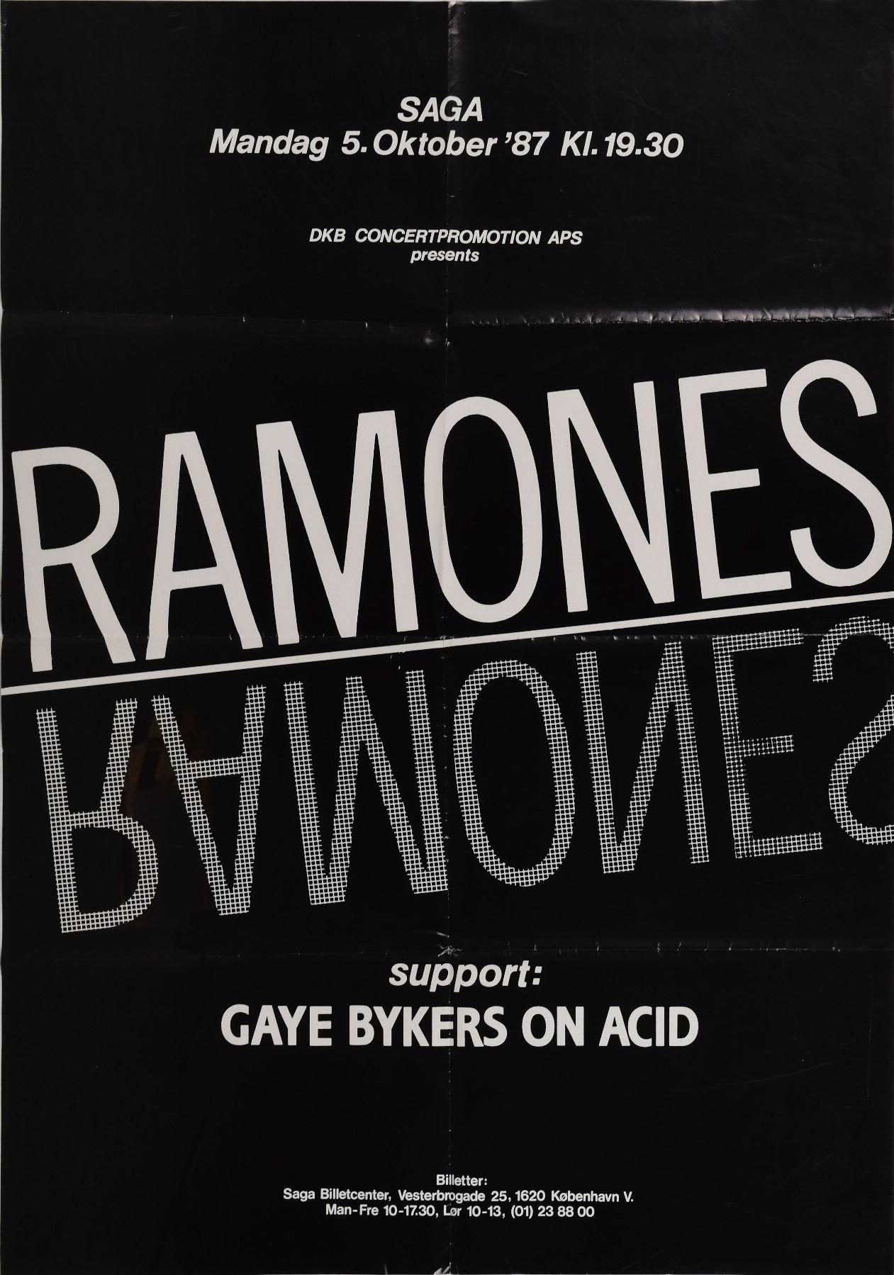 Uncommon original poster for a Ramones concert on October 5, 1987, at the Saga Rockteater in Copenhagen, Denmark, 23.75 x 33.25, with a large mirror image of the Ramones logo and listing the supporting act as Gaye Bikers on Acid. In fine, folded condition, with expected wear.
