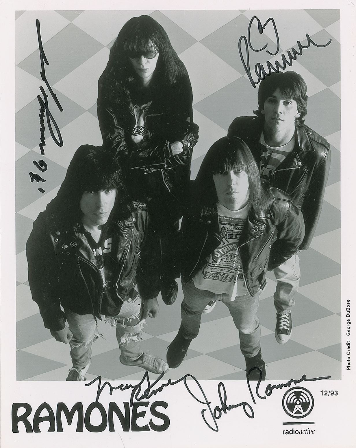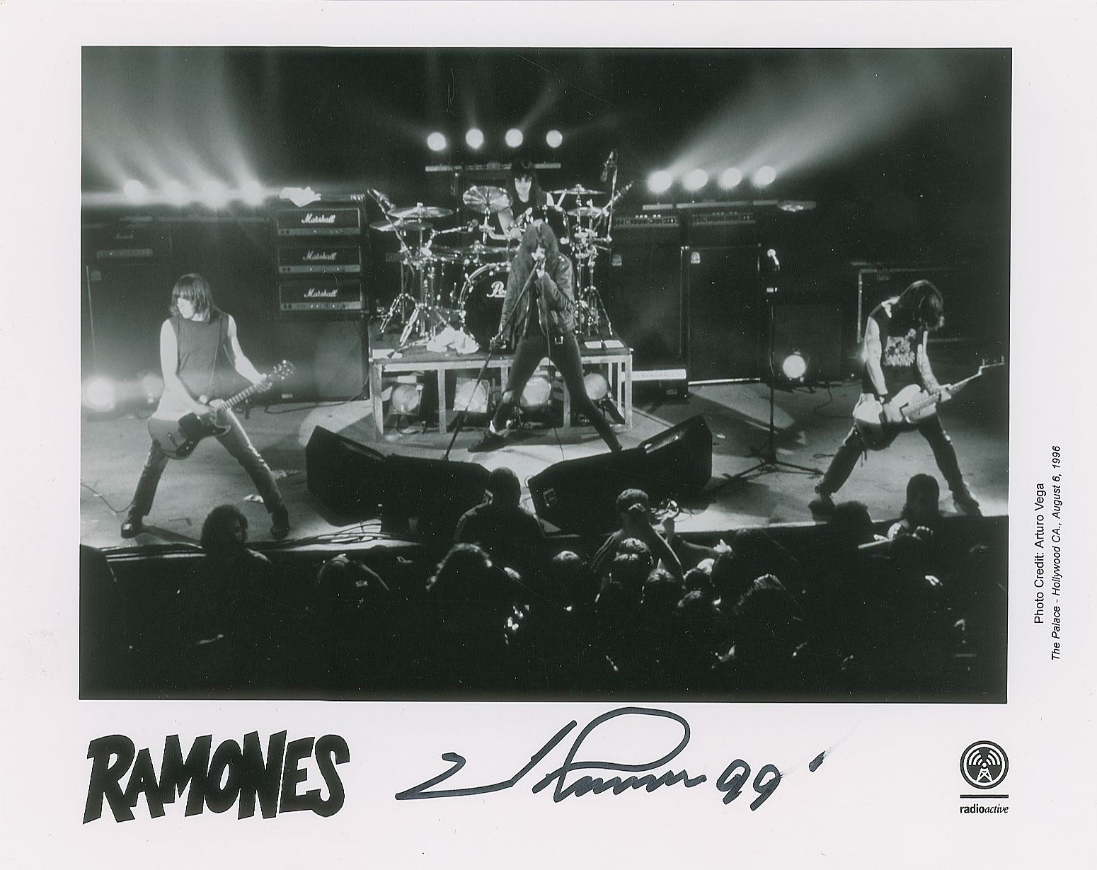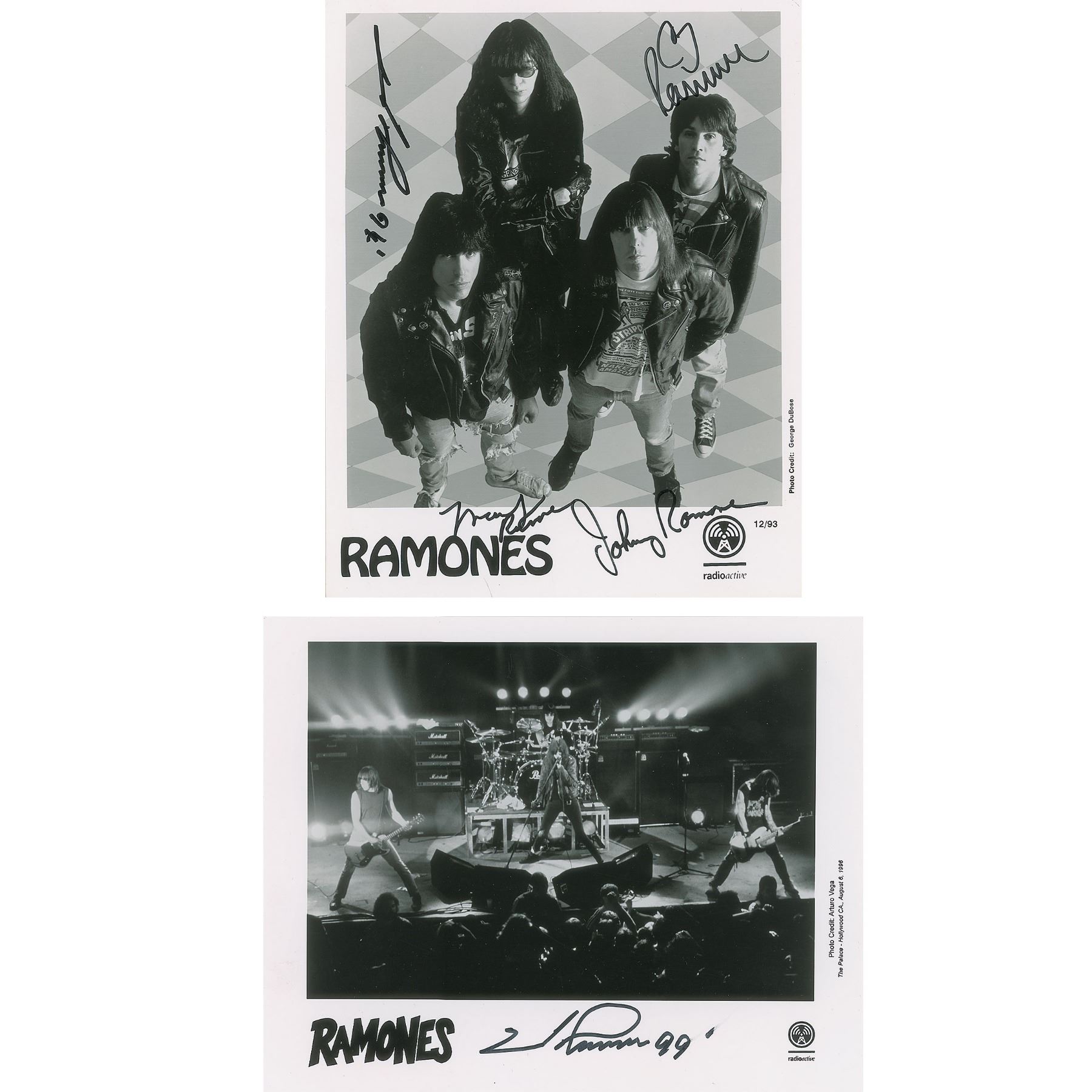 Two Radioactive Records promotional photos: a glossy 8 x 10 photo of the Ramones against a checkered background, signed in black felt tip by Johnny, Marky, CJ, and Joey Ramone, who adds "94"; and a satin-finish 10 x 8 photo of the punk legends rocking on stage, signed in black felt tip by Joey Ramone, who adds "99." In overall very good to fine condition, with creasing to the upper right corner of the group photo.