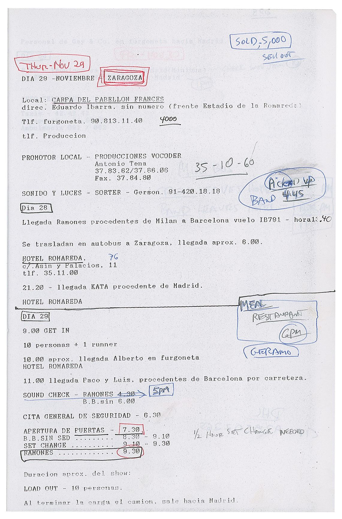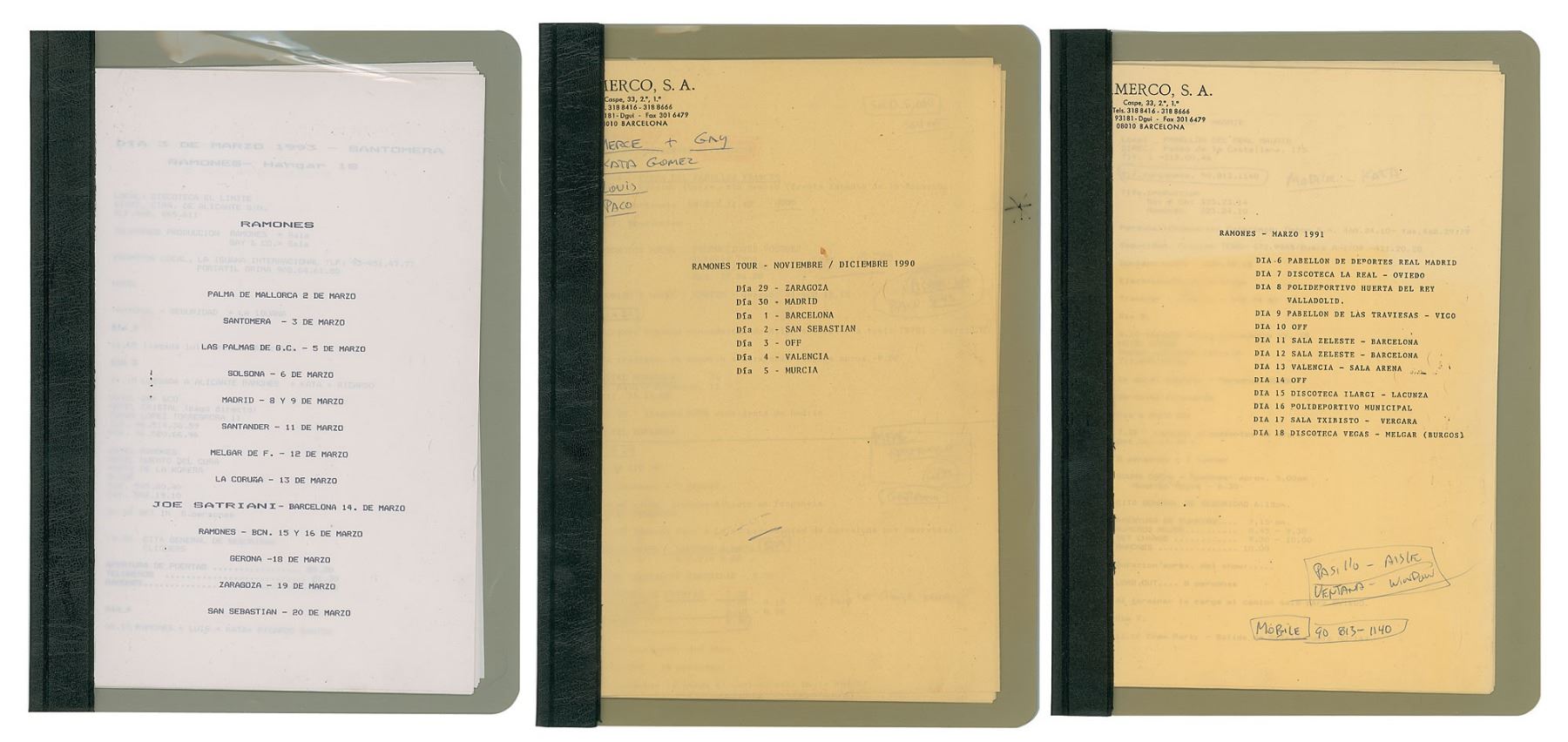 Group lot of three tour itinerary packets used for Ramones tours of Spain in the early 1990s, including: an itinerary for the band’s six-concert tour between November 29 and December 5, 1990; an itinerary for the band’s 11-concert tour between March 6 and 18, 1991; and an itinerary for the band’s 12-concert tour between March 2 and 20, 1993. The packets consist of calendars and show and daily itineraries relating to flight schedules, accommodation, venue details, and ground transport, with the two earlier itineraries annotated in ballpoint with various contacts, addresses, and times. In overall fine condition.