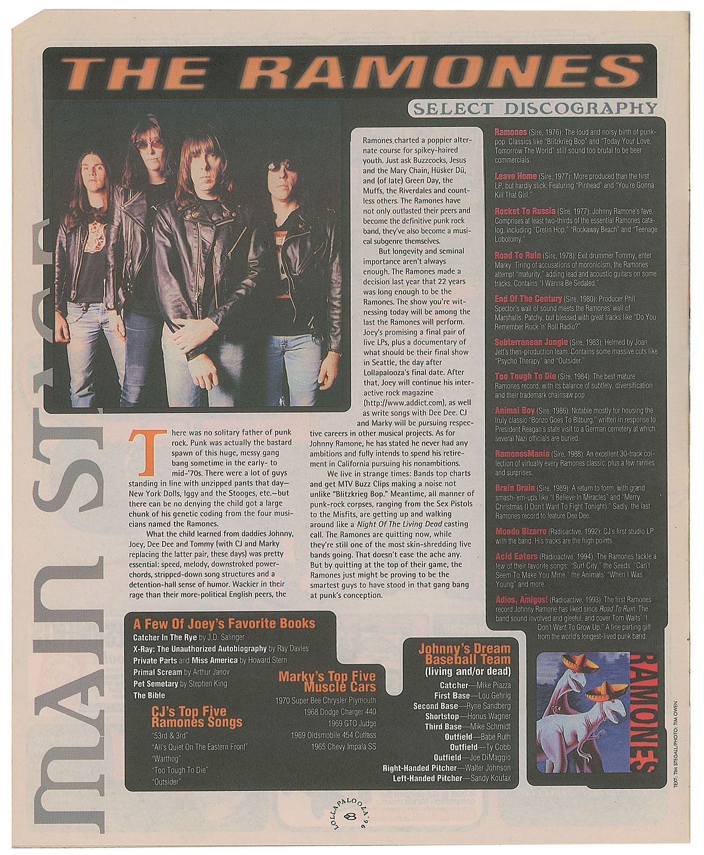 Group lot of material related to the Ramones' participation in the 1996 Lollapalooza music festival held between June 27 and August 4, 1996, which includes: a schedule listing the 20 dates, venues, capacity, and the distance between each city; calendar sheets for the full Lollapalooza tour, annotated in ballpoint with August 6th marked in as "Billboard Live"; a Lollapalooza production contact information packet; a Lollapalooza third annual contact sheet packet; and an official "Lollapalooza '96" magazine. In overall fine condition.