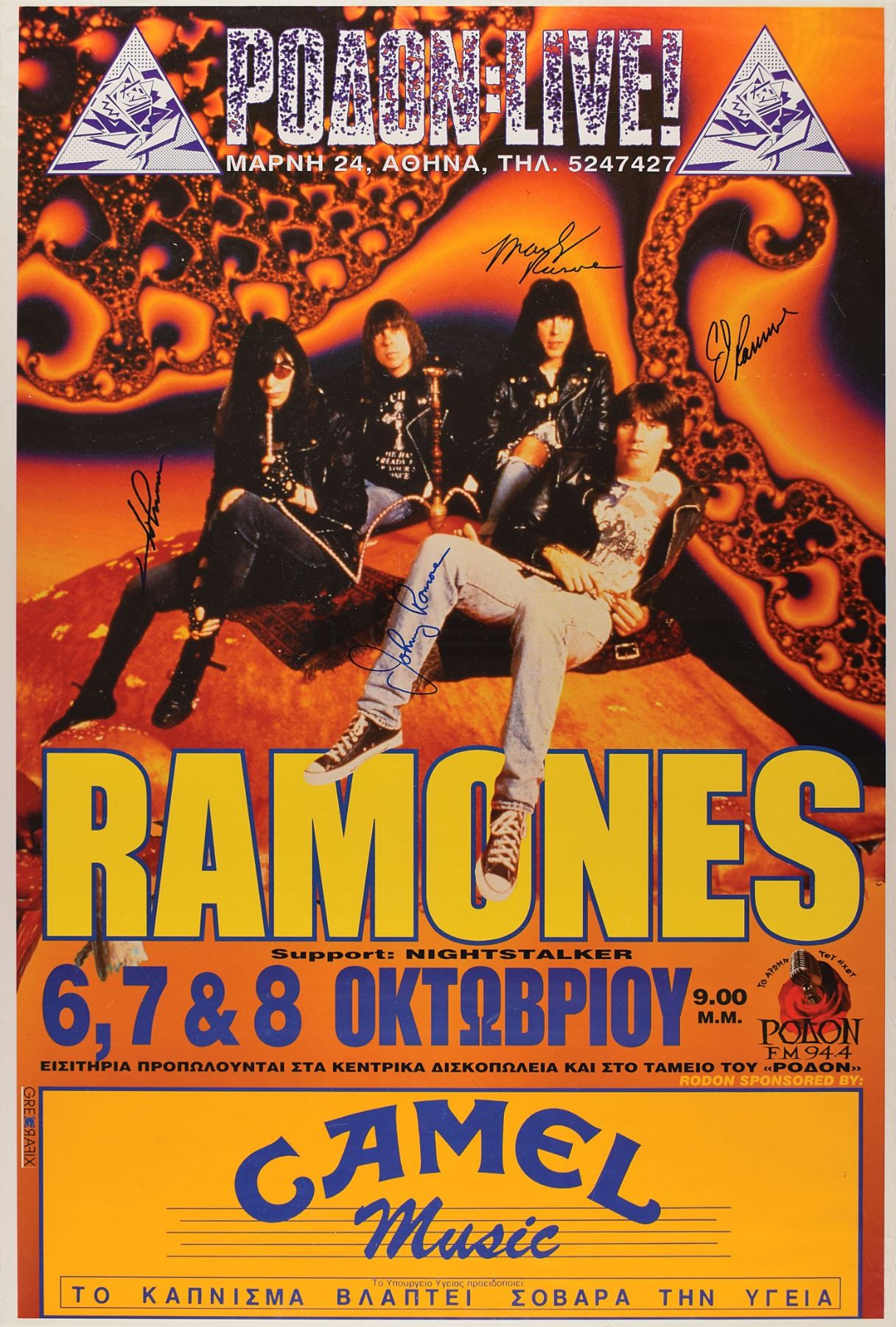 Color 22.75 x 33.75 poster for a series of three Ramones concerts at the Rodon Club in Athens, Greece on October 6–8, 1994, signed in black felt tip by Joey, Marky, and CJ Ramone, and in blue felt tip by Johnny Ramone. The poster shows the band relaxing with a hookah against a psychedelic backdrop, with the supporting act listed as Nightstalker. Rolled and in fine condition, with scattered light creasing.