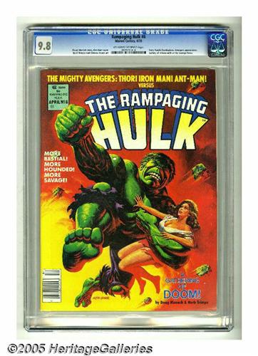 <B>The Rampaging Hulk #8 (Marvel, 1978) CGC NM/MT 9.8 Off-white to white pages.</B></I> Painted cover by Ken Barr. Herb Trimpe and Alfredo Alcala art. Terry Austin frontispiece. The Avengers guest-star, in a story set prior to <B>Avengers</B></I> #1. Includes a pin-up gallery of famous Hulk guest stars, with art by George Perez. Overstreet 2005 NM- 9.2 value = $14. CGC census 3/05: 1 in 9.8, none higher. <I>From the collection of Chris Bell.</B></I>