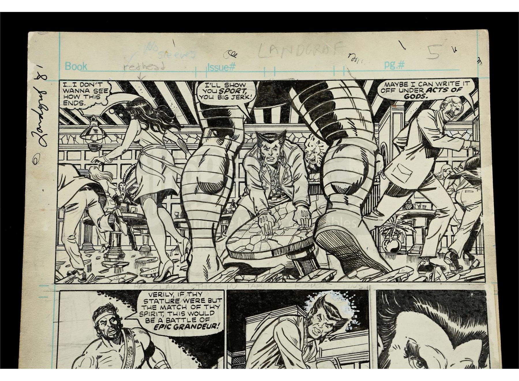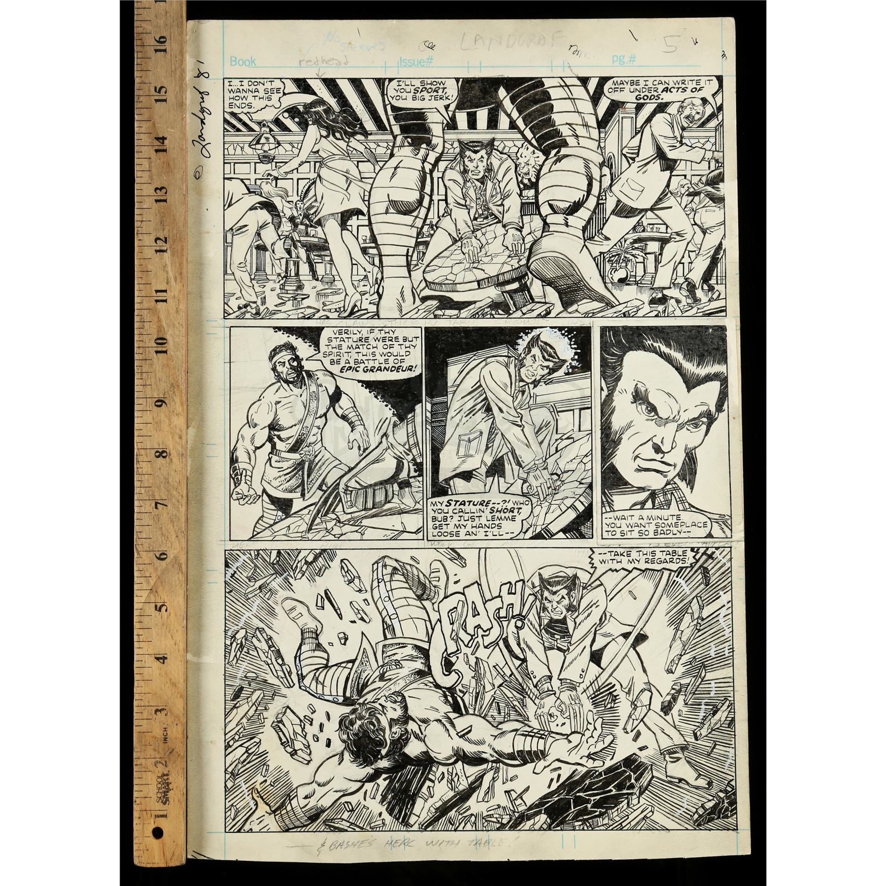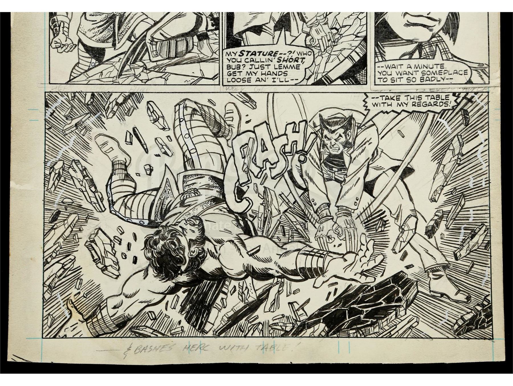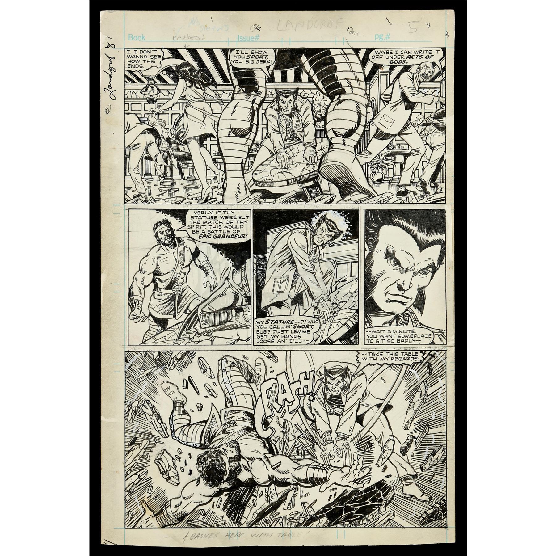 Ken Landgraf (Penciler), George Perez (Inker)Marvel Comics, 1980Wolverine's first solo appearance outside X-Men. Features handwritten notations, an unlabeled character illustration, and Ken Landgraf's signature.Condition:Fair; some residue from being laminated; bottom right corner is cut.Dimensions: 17" x 11" x 1" (42.5cm x 27.5cm x 2.5cm)$2,000-3,000