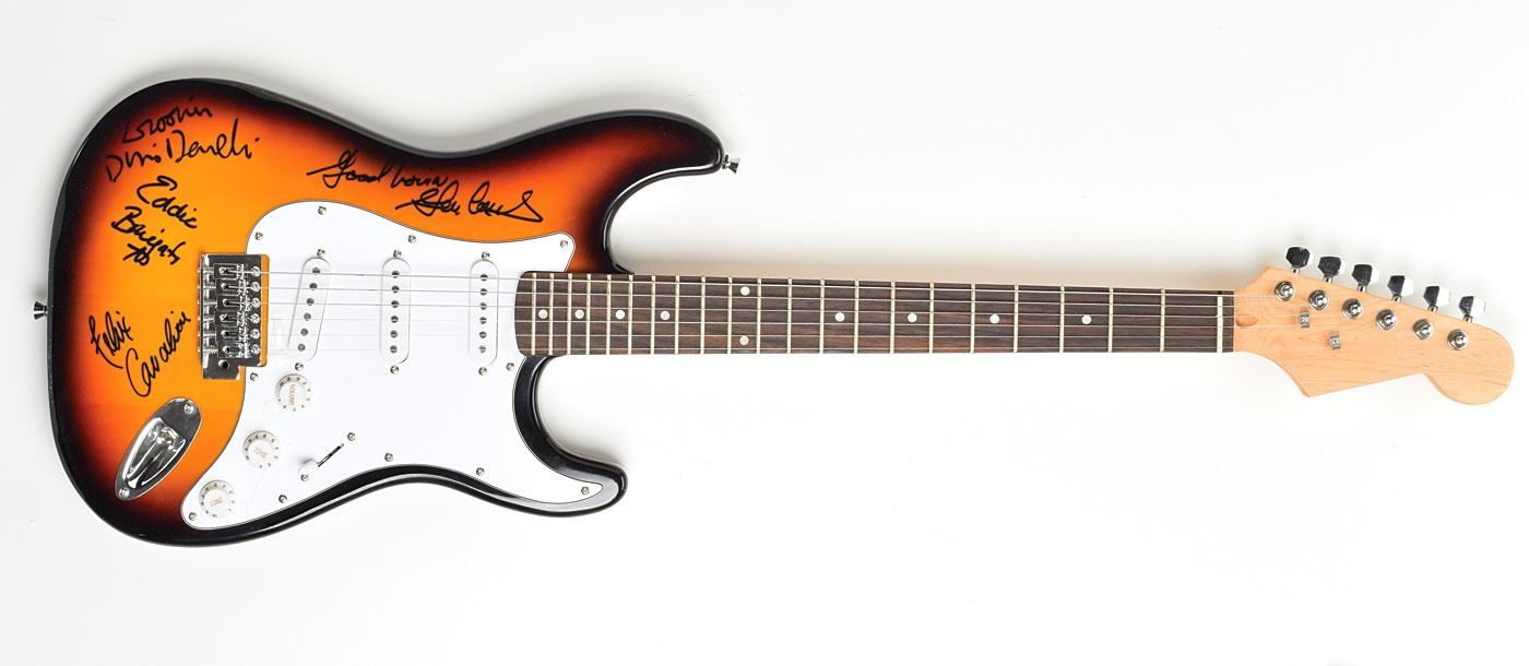 Black-bodied Stratocaster-style electric guitar with a sunburst finish, signed on the body in black felt tip, "Groovin,' Dino Danelli," "Felix Cavaliere," "Eddie Brigati," and "Good lovin,' Gene Cornish." In fine condition.