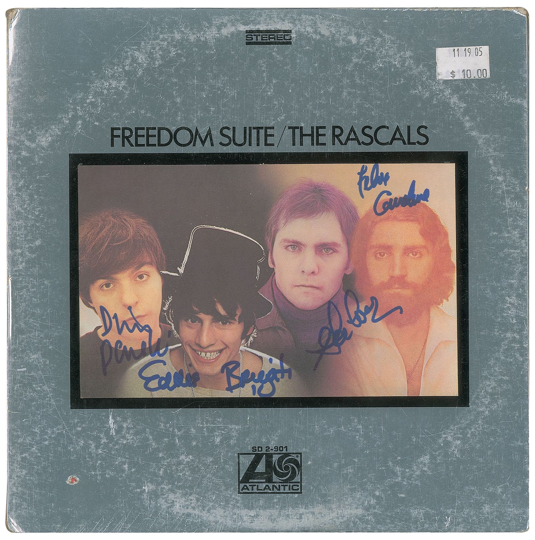 Freedom Suite album by The Rascals, signed on the front cover in blue felt tip by Felix Cavaliere, Eddie Brigati, Gene Cornish, and Dino Danelli. In very good to fine condition, with light scuffing, a small discount hole to the lower left, and an affixed price sticker. The records are included.