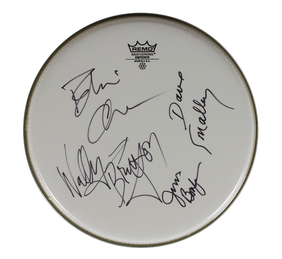 Off-white Remo Weather King Emperor drum head, 12.5? in diameter, signed in black felt tip by Wally Bryson, Dave Smalley, Jim Bonfanti, and Eric Carmen. In fine condition.