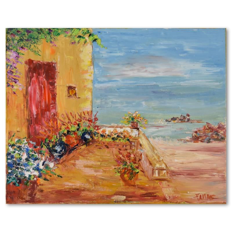 "The Red Door" is an original oil painting on stretched canvas by Elliot Fallas, hand signed by the artist. Includes Letter of Authenticity. Measures approx. 20" x 16" (image). The sides of the canvas are painted and it can be hung as is, but a frame is definitely recommended.