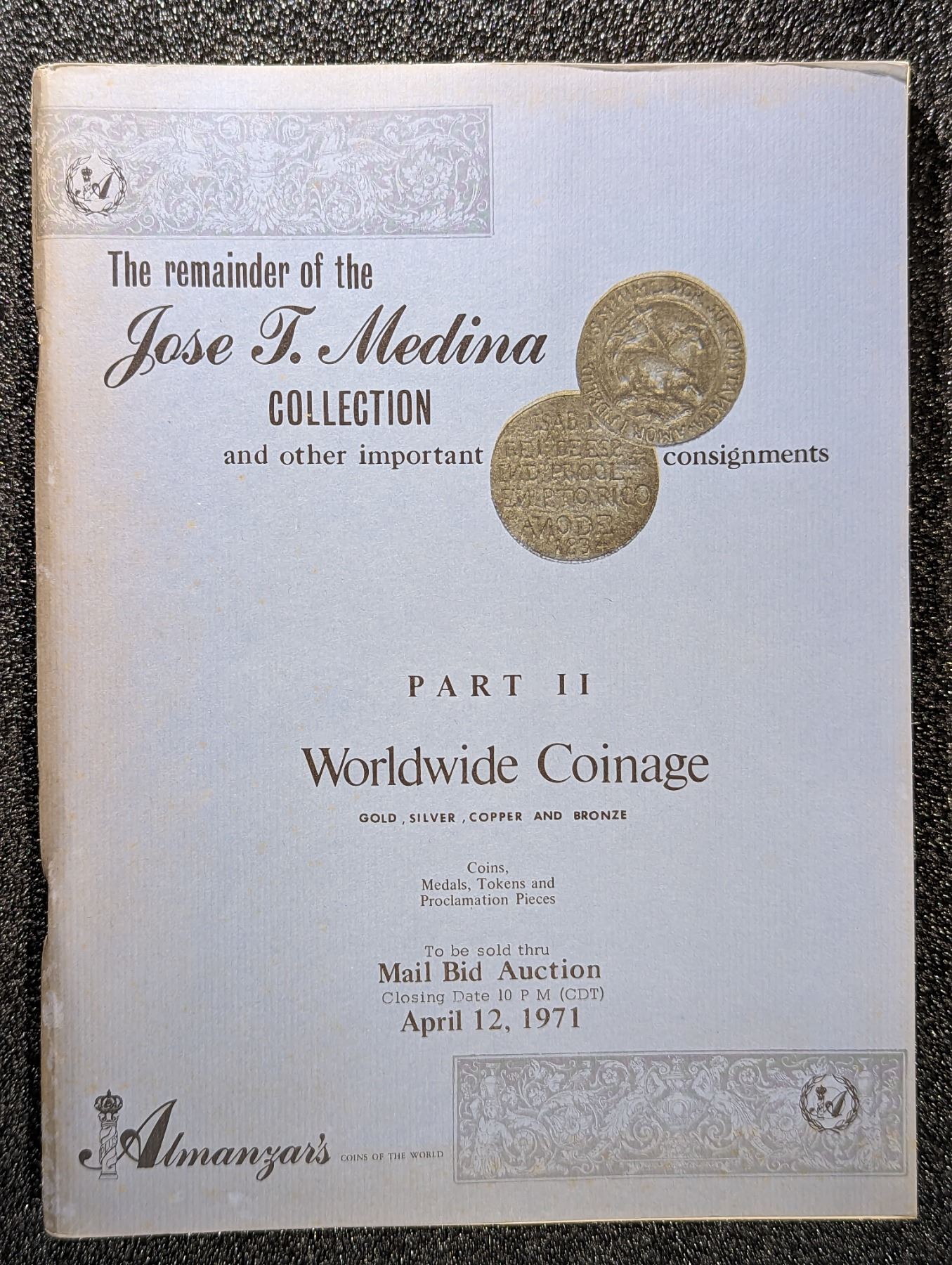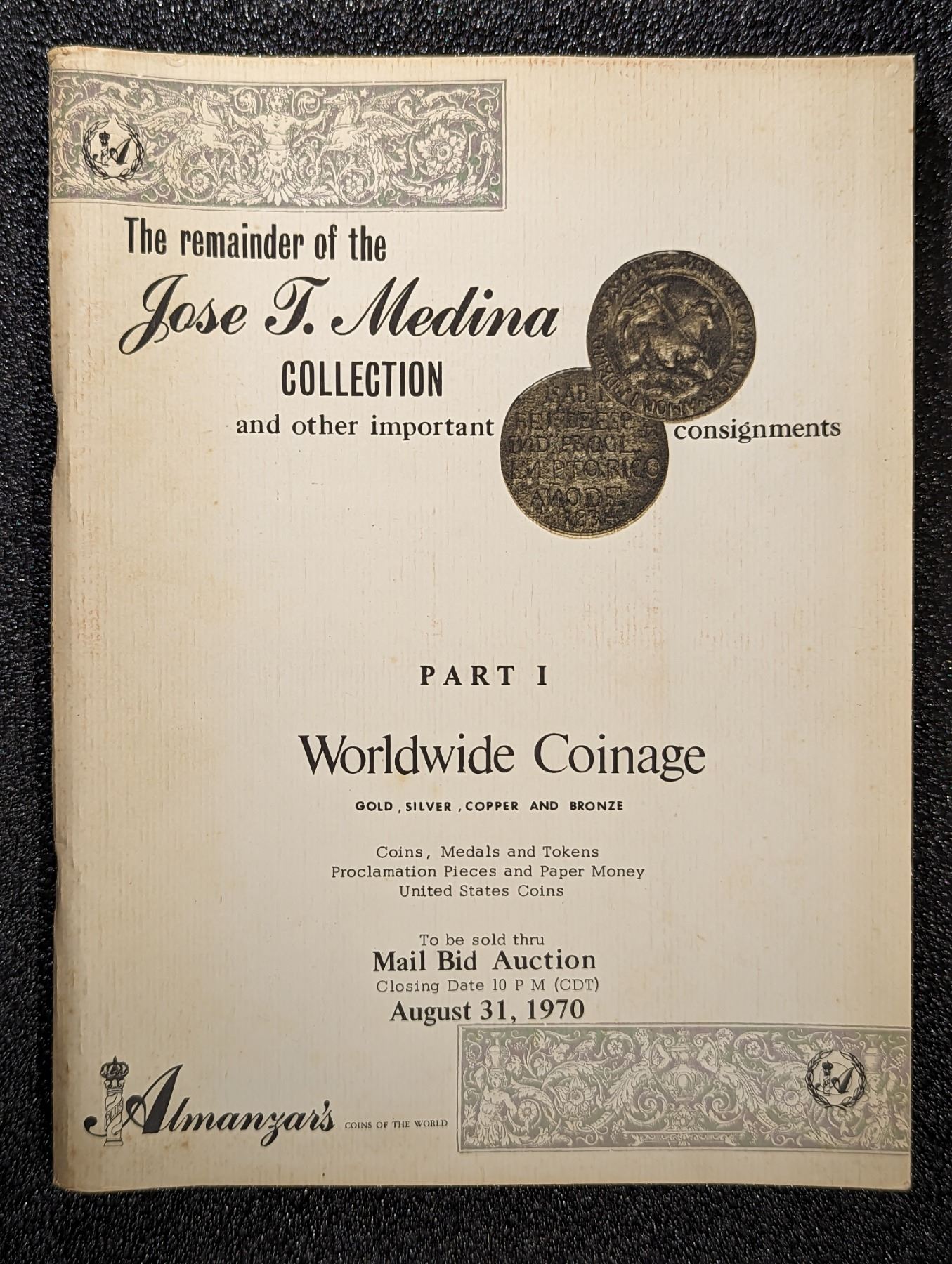 (1) Almanzar's Coins of the World, Inc. The Remainder of the Jose T. Medina Collection and other Important Consignments. Part I. Worldwide Coinage. August 31, 1970. 1-1633, 1700-1900, 2000-2962, 3000-3247, 3300-3698, 3700-4485, 4500-4663, 5500-5568, 5600-5692, 5800-5809, 6001-6016 Lots. 4to. Original printed card covers. Mail Auction Sale. San Antonio. 112 Pages. b&w coin, token and medal photos throughout. Fine.