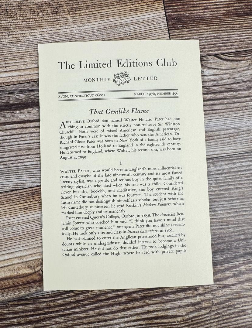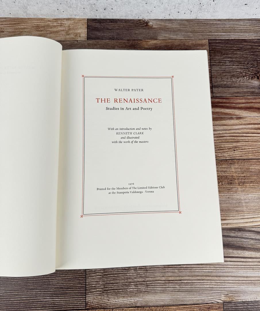 Walter Pater, 1976. Limited Editions Club 1639 of 2000. Provenance- from the estate of former Ford Motor Company CEO Donald E. Petersen.
