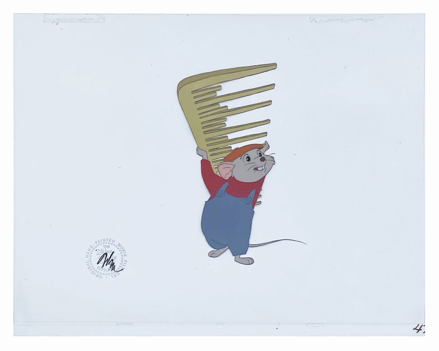 (Disney, 1977) An original production cel of Bernard from The Rescuers. The slightly trimmed cel measures 12.5"x15.25" and has a Walt Disney Company seal in the lower left hand corner as prepared by the studio for sale. The image measures 7.5"x4.5" and the cel is in fine condition with only slight wear.