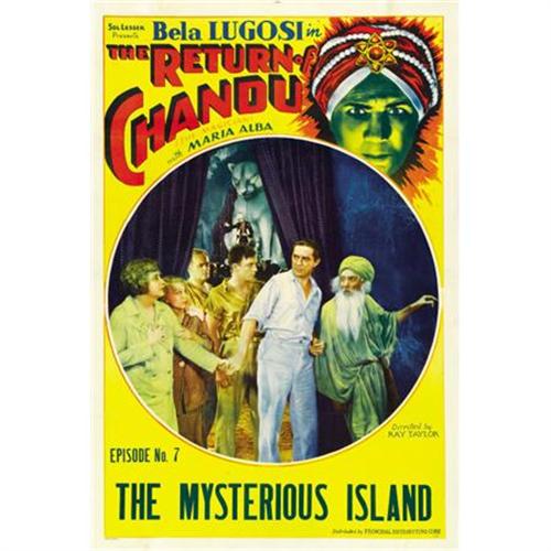 <B>The Return of Chandu (Principal Distributing, 1934).</B></I> One Sheet (27" X 41") Chapter 7 -- "The Mysterious Island." Bela Lugosi stars as the famous magician, Chandu, who leaps to the rescue when a consultation with his crystal ball reveals that Egyptian princess Nadji is about to be sacrificed by the cat-worshipping Ubasti cult. This 12-chapter Principal Pictures serial was based on the "Chandu"<I> </B></I>radio program. (Lugosi also starred in the 1932 adaptation of Chandu, not as the magician, but as a villain.) This poster has edge wear in the top border, a small amount of missing paper in the top left, and crossfold separations and tape abrasions in the upper and lower borders. The restoration masks most of these issues. Fine- on Linen. <BR><BR><b>Shipping:</b> Rolled Material (<a target="_blank" href="http://www.heritageauctions.com/common/shipping.php">view shipping information</a>)