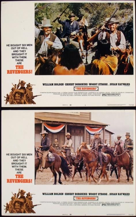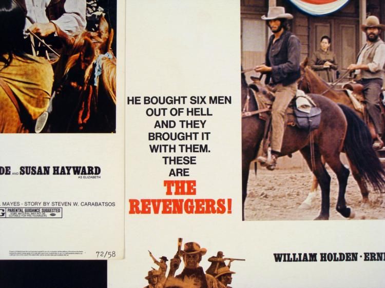 Here are two original lobby cards from the 1972 movie "The Revengers." This Western has plenty of action, and these posters capture some of those scenes well. Size: 14 x 11 inches Condition: Very good; smudging, minor creases and a couple tears at the upper margin