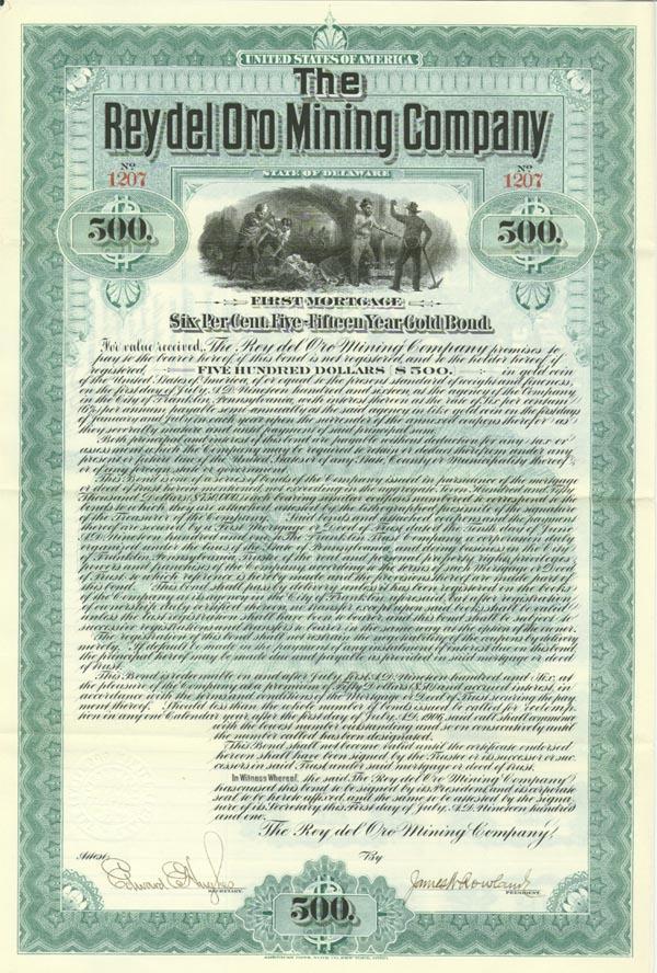 1901, Delaware. $500 Bond Bearing 6% interest. Top center vignette of miners working. Coupons at right. Uncancelled and Extremely Fine.
