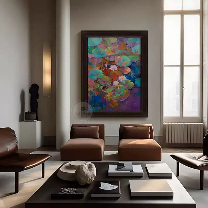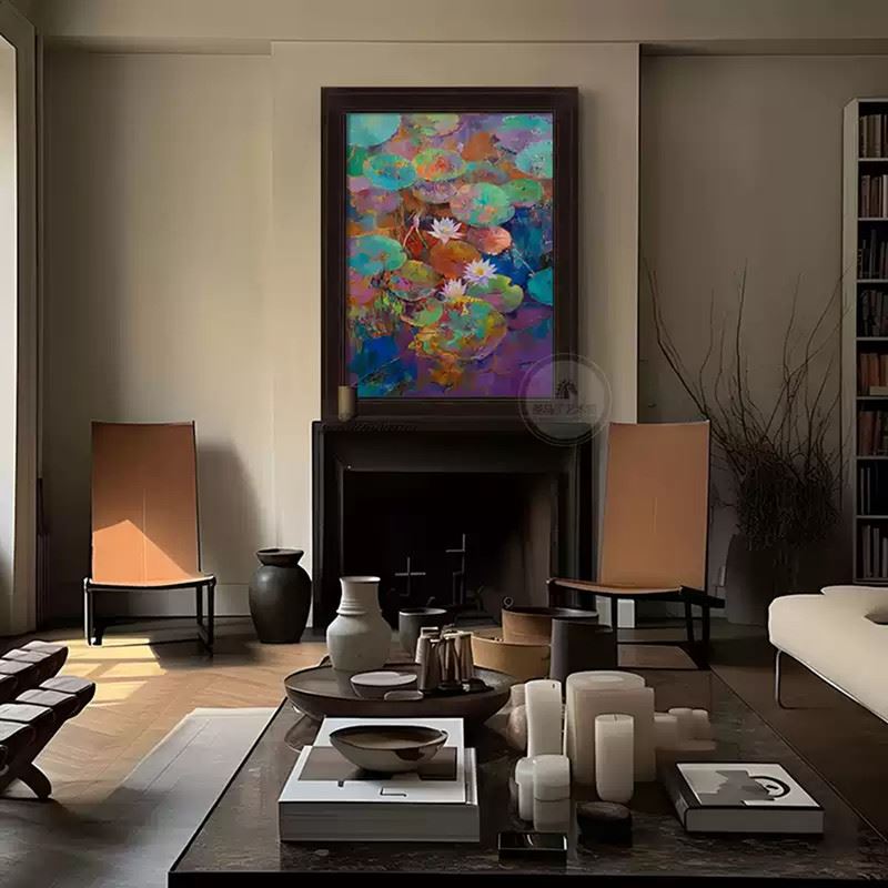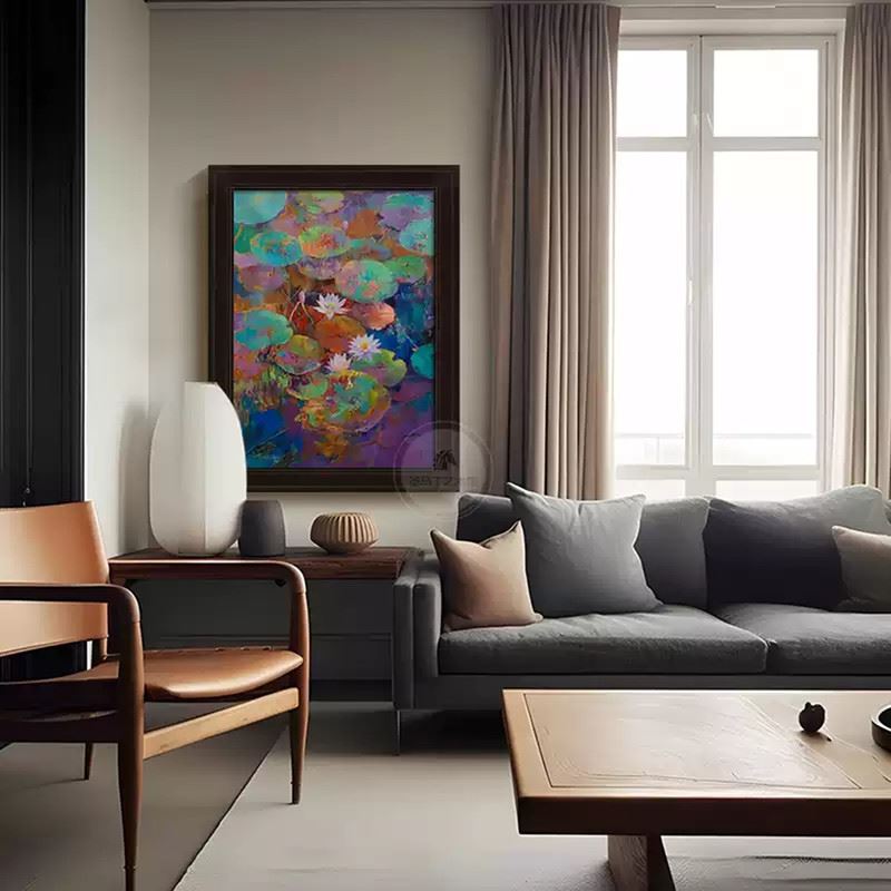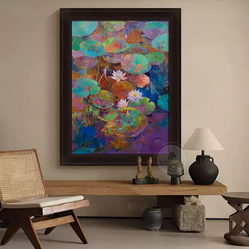 This artwork showcases water lilies and floating leaves in a pond, using vibrant colors and depth. The vivid flowers and colorful lily pads intertwine, presenting a natural beauty that is both serene and full of life. Dimensions: 24 x 31 inches.