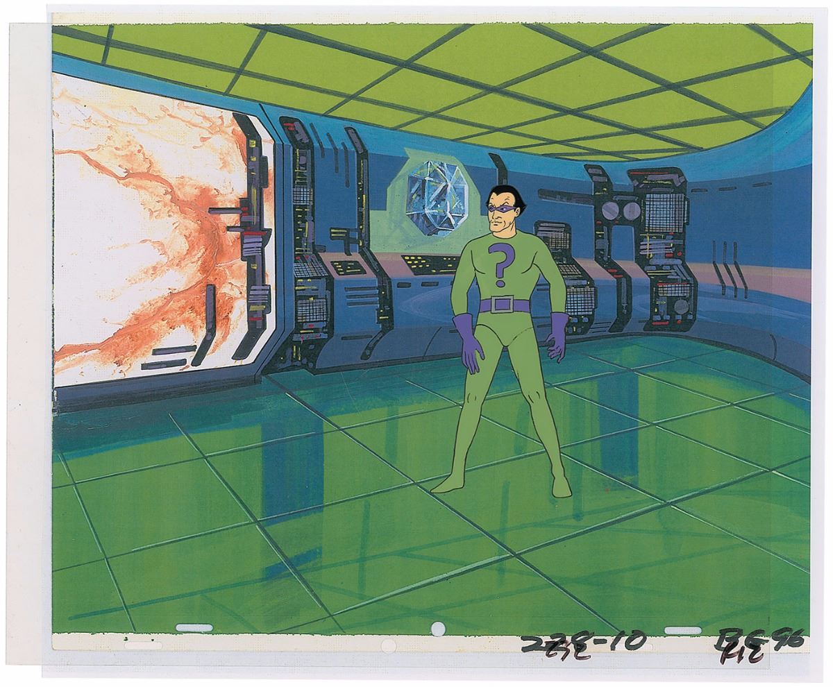 (Hanna-Barbera Studios, 1978) Original production cel featuring The Riddler from SuperFriends, showing the enigmatic fiend standing in a secret lair. The cel is placed on a color copy background. Image measures 2.25 x 5, with overall dimensions of 12.75 x 11. In fine condition, with trivial soiling and lifting to paint.