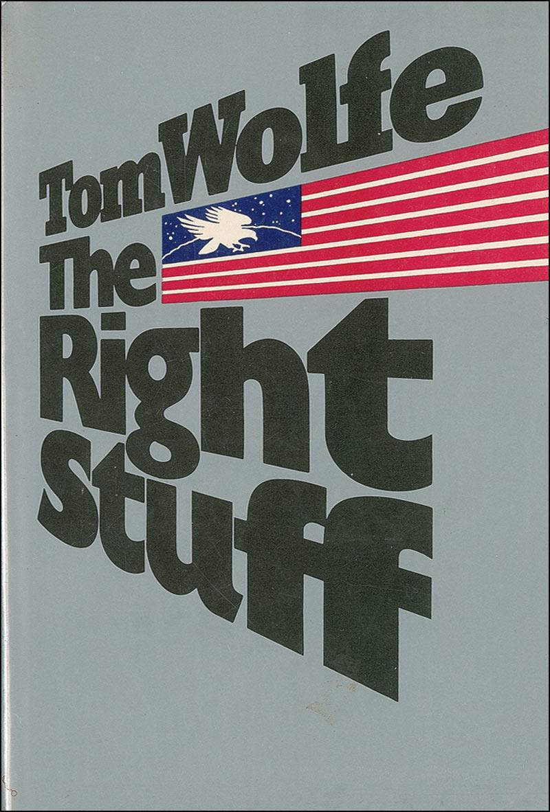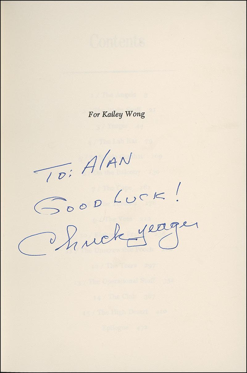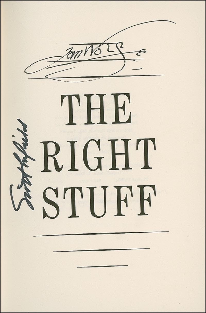 Signed book: The Right Stuff. First edition, first printing. NY: Farrar, Strauus, Giroux, 1979. Hardcover with dustjacket, 5.75 x 8.5, 436 pages. Signed on the title page by Scott Crossfield and Tom Wolfe, and signed and inscribed on the dedication page by Chuck Yeager. In fine condition, with some mild toning and creasing to dustjacket.