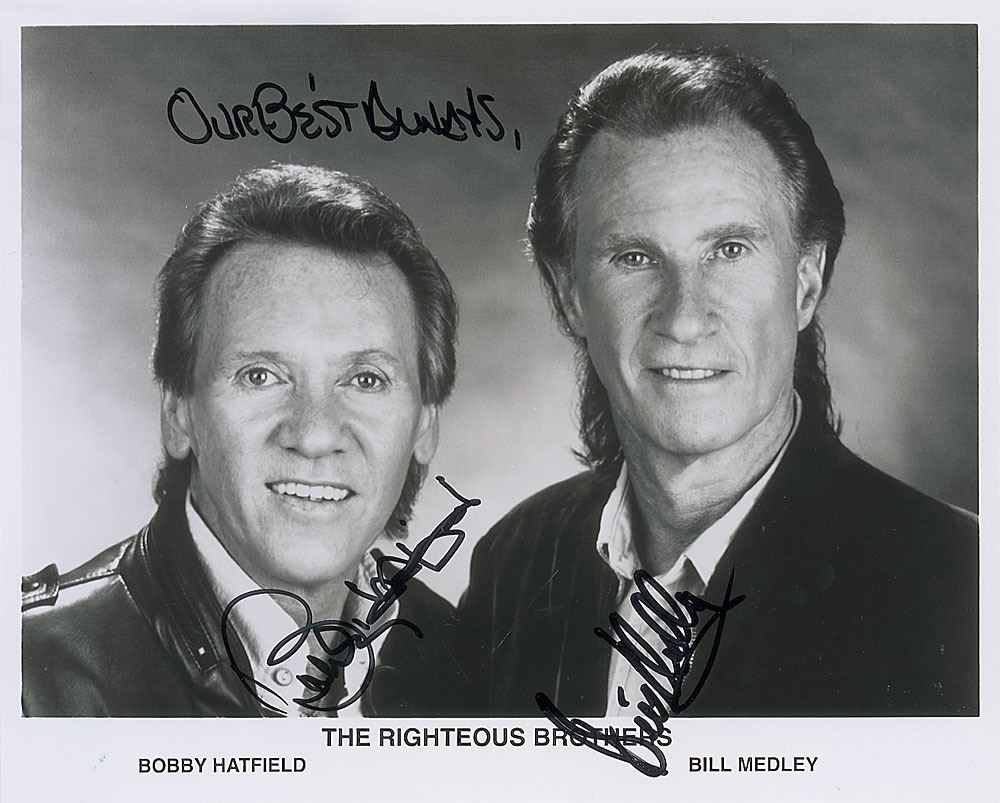 Glossy 10 x 8 publicity photo, signed in black felt tip, “Our Best Always, Bobby Hatfield,” and “Bill Medley.” In very fine condition.