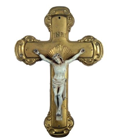 The Ring Crucifix Prop - In the Naomi Watts starring horror mystery "The Ring" (2002), a videotape causes the death of anyone who watches it. In this "running against time" thriller, Naomi finds that she not only has to try and save those who have watched it, but now must save her own life and that of her own son! This is a beautifully crafted faux gold and marble Crucifix used as a background set decoration prop in the production. Approx 6"x10".