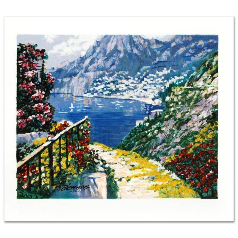 "The Road to Positano" is an embellished limited edition serigraph on canvas, numbered and hand signed by Howard Behrens (1933-2014). Measures approx. 20" x 16.5" (image).