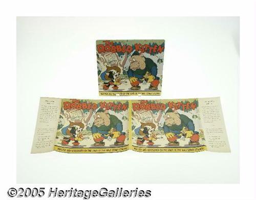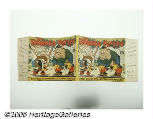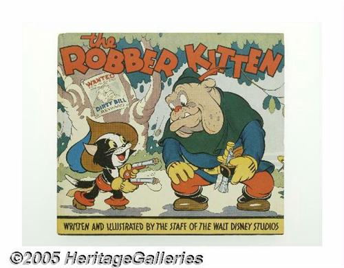 <B>The Robber Kitten with Dust Jacket (Whitman, 1935) Condition: VF/NM.</B></I> All four of the scarce Whitman "oblong" Disney books from 1935 are being offered in the present auction -- and this may be the best-conditioned copy of the four. Binding is very tight, interior paper quality is quite good and the covers show virtually no wear. Likewise, the dust jacket is just great, showing only the very mildest edge/corner/top-bottom of spine wear and a couple of very small edge tears. There is a small neatly penned inscription at top edge of first interior page. Unless you raid the Disney archives, it's hard to imagine finding a cleaner copy. The book grades Near Mint, the dust jacket is Very Fine. <I>From the Larry Jacobs Collection.</B></I>