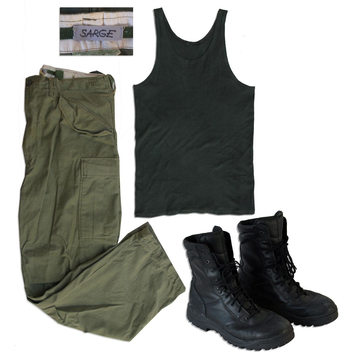 Costume worn by Dwayne ''The Rock'' Johnson as Gunnery Sergeant Asher ''Sarge'' Mahonin in action feature ''Doom''. Civilian costume comprises: (1) a pair of khaki green cargo pants labelled ''Sarge'' in size L, (2) dark green tank top and (3) a pair of black combat boots in UK size 12 labeled ''#2 Sarge''. Near fine. With wardrobe department's tag and a COA from the Prop Store.
