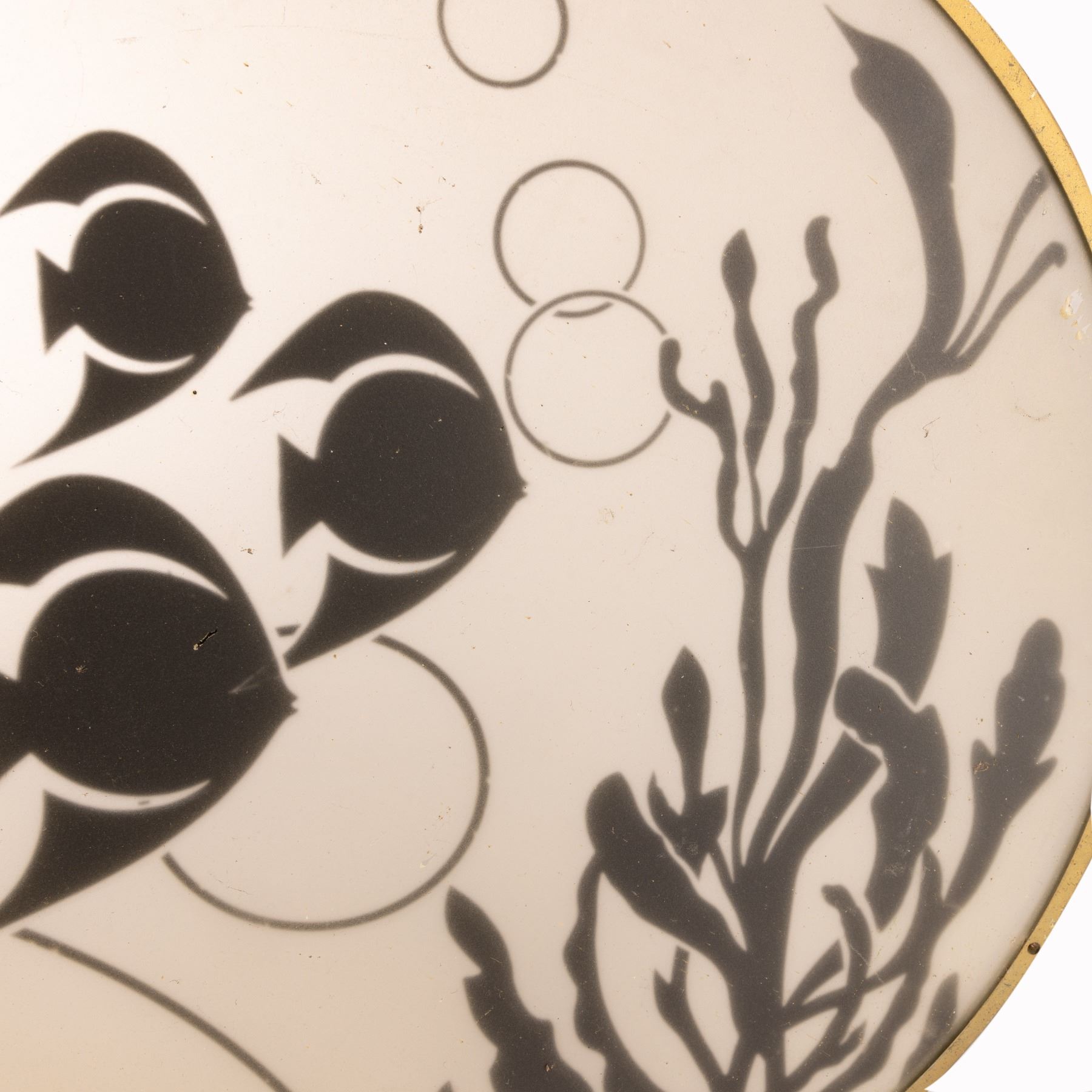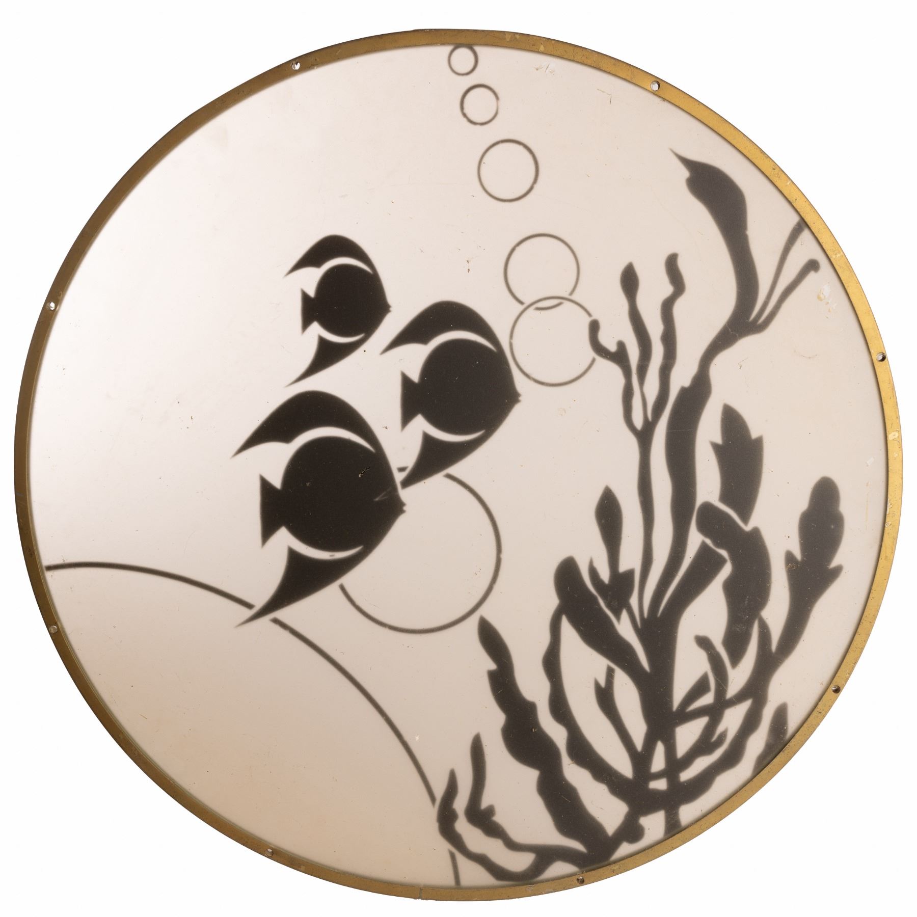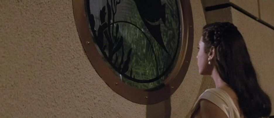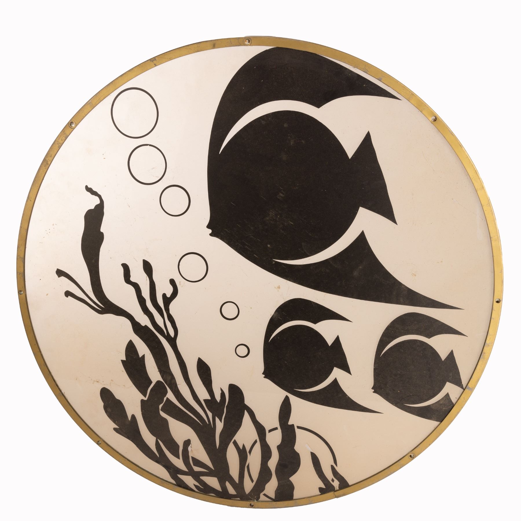 During the film, The Rocketeer (Bill Campbell) fights the henchman of Neville Sinclair (Timothy Dalton) at the South Seas Club located in Los Angeles, California and this window can be seen as The Rocketeer makes his escape. This custom-made, circular window features an underwater scene that depicts three Angelfish swimming above coral while their air bubbles are rising to the surface. The Angelfish and underwater environment are painted black. The border of the window is made up of a gold-like metal finish. This piece comes with a COA from Studio Auctions.