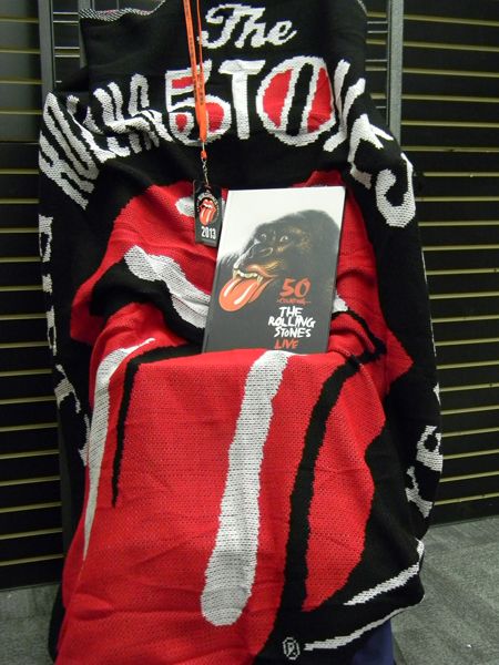 The 50th anniversary "Rolling Stones" VIP promo package comes with a large throw blanket featuring the infamous tongue logo, a backstage laminate on cord, a coffee table hardcover book of the tour, and a black cloth tote bag. The package was given to the ticket holders who paid $2,400 each only. This item comes with a certificate of authenticity guaranteed for the life of the piece.