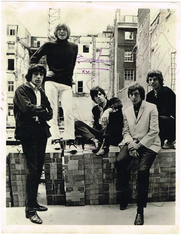 Photograph of the band with the autographs of Brian Jones, Mick Jagger, Keith Richards, Bill Wyman and Charlie Watts alongside their respective images.