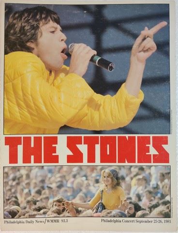 The Rolling Stones concert promotional poster distributed by Philadelphia Daily News and WMMR 93.3. Light edge wear, light creases. Excellent. (9.5"x12.5").