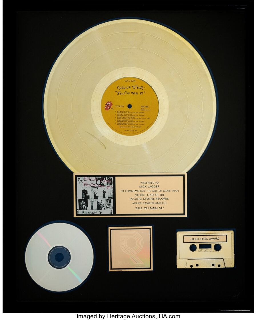 The Rolling StonesExile On Main StRIAA Hologram R Gold Sales Award Presented to Mick Jagger. A gold sales award presented to the frontman of the legendary British rock group. According to the plaque in the center portion, "Presented To / Mick Jagger / To Commemorate the Sale of More Than / 500,000 Copies of the / Rolling Stones Records / Album, Cassette and C.D. / ‘Exile On Main St'." Measures 17" x 21". In Very Good Plus condition with various chippings on the frame, smudges on the frame in the left and right corners, and peeling on the record label on the disc. COA from Heritage Auctions.