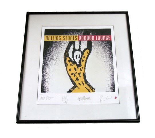Rolling Stones limited edition lithographic print of their Voodoo Lounge album complete with plated signatures of the artists. Comes with a certificate designating piece is 2543/5000. (approx. 27" x 29")