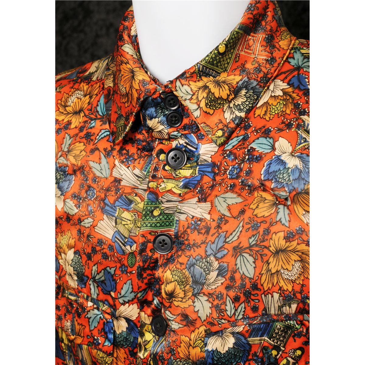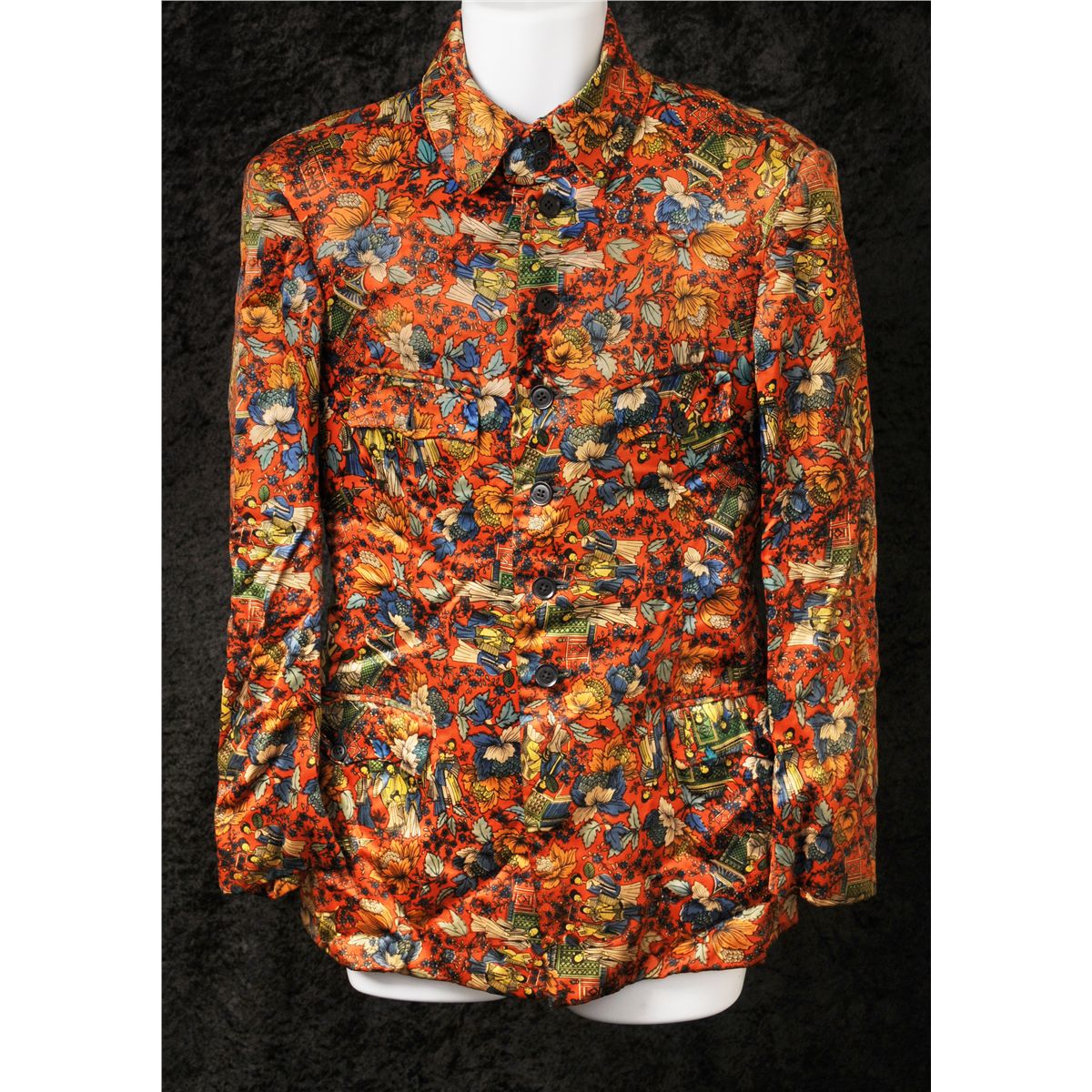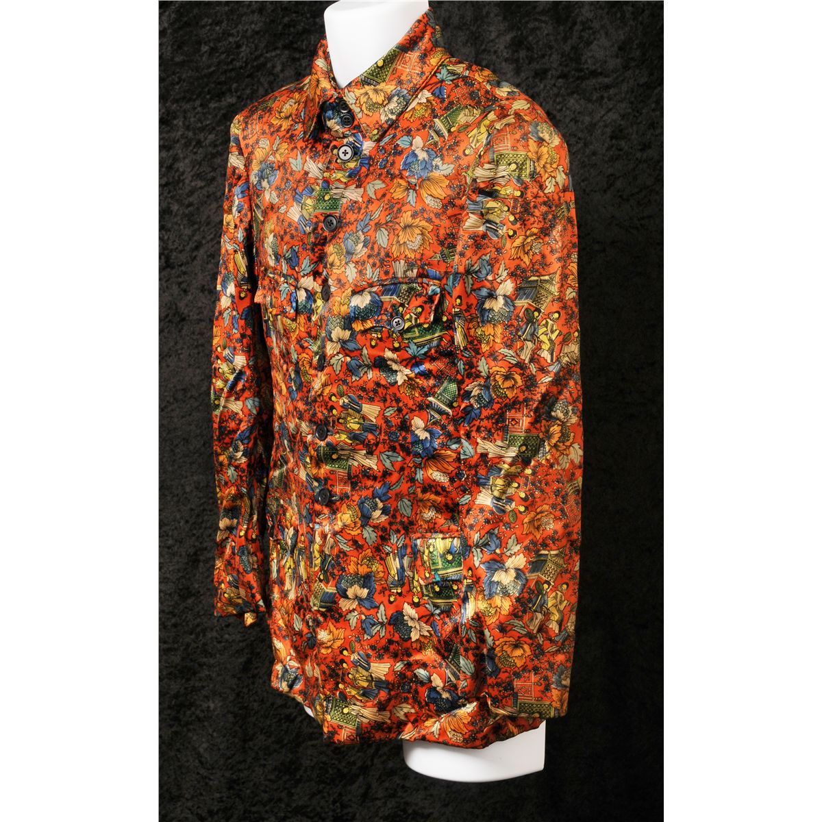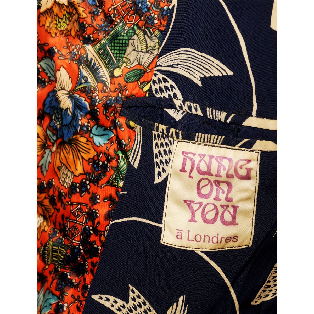 a red satin jacket printed overall with pattern of dragons, pagodas and other oriental motifs, front with six buttons and four pockets with button-fastening, single vent, inside pocket labelled Hung On You a Londres, blue and white floriate lining, a Michael Rainey for his 'Hung on You' boutique