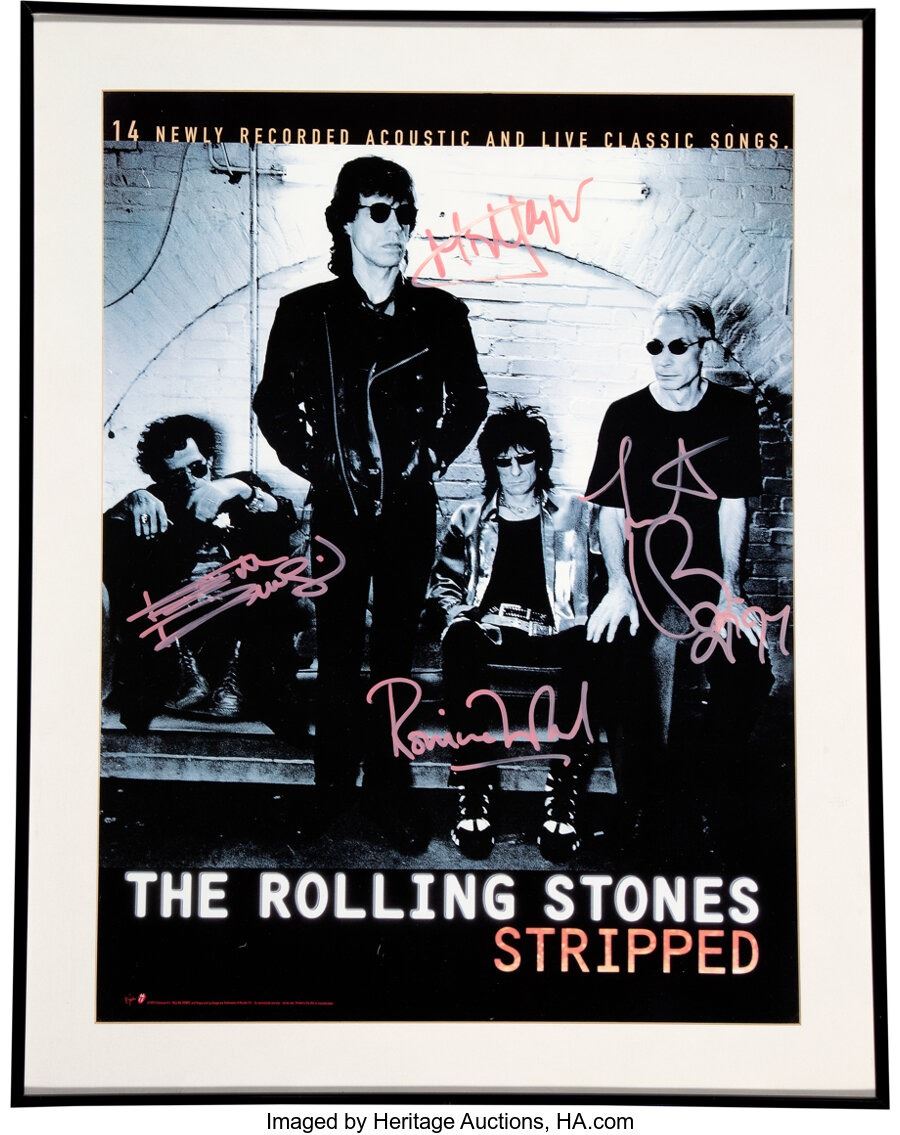 The Rolling Stones SignedStrippedPromo Poster. Matted and framed to an overall 21 ¾" x 28", this promo poster for the Rolling Stones' Strippedrelease, signed by the four main members (Mick Jagger, Keith Richards, Ronnie Wood, and Charlie Watts) all signed with a pink felt tip. In Very Good Plus condition with some separation in the frame in the upper left and right corners, along with creasing and ripping to the poster, along with some light chipping on the frame. COA from Heritage Auctions.