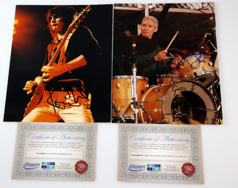The Rolling Stones- Two signed 10 x 8 inch photographs, signed by Ronnie Wood & Charlie Watts (2).Provenance: Certificates of authenticity.