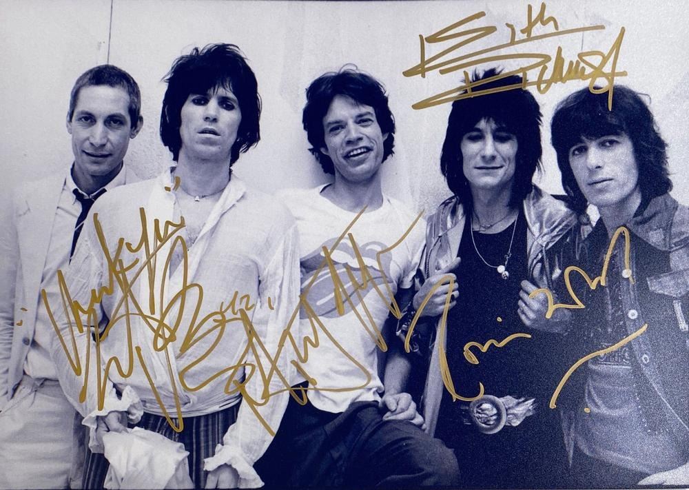 The Rolling Stones band facsimile signed photo autographed by Muck Jagger, Keith Richards, Ron Wood and Charlie Watts. 8x10 inches. This item is a reprint of an original autograph