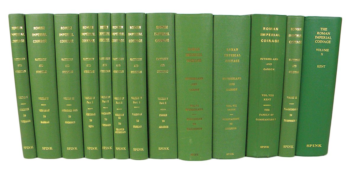Mattingly, Harold, Edward A. Sydenham, C.H.V. Sutherland, R.A.G. Carson and J.P.C. Kent [editors]. THE ROMAN IMPERIAL COINAGE. VOLUMES I-X. London: Spink. Ten volumes, complete, as issued in thirteen. Publication dates of each volume are as follows: Vol. I, 1968; Vol. II, 1968; Vol. III, 1968; Vol. IV [in 3], 1968; Vol. V [in 2], 1968; Vol. VI, 1967; Vol. VII, 1966; Vol. VIII, 1981; Vol. IX, 1968; Vol. X, 1994. Original publisher's green cloth bindings throughout, upper covers and spines lettered in gilt. Lightly used; near fine. Harry W. Bass Jr.'s set, with his bookplate. Most volumes are later printings. The best overall work covering the entire range of the coinage of the Roman Empire. Clain-Stefanelli 4056*. Grierson 75. Kroh 70 (five stars): "covers the period 28 BC to 395 AD and it is the current standard reference used by all. This is definitely essential for all collectors."
