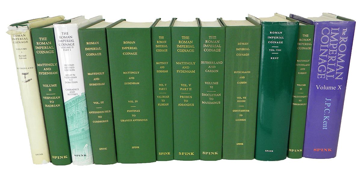 [Roman Imperial Coinage]. Mattingly, Harold, Edward A. Sydenham, C.H.V. Sutherland, R.A.G. Carson and J.P.C. Kent [editors]. THE ROMAN IMPERIAL COINAGE. VOLUMES I-X. London: Spink. Ten volumes, complete, as issued in twelve. Publication dates of each volume are as follows: Vol. I [revised edition], 1984; Vol. II, 1997; Vol. II, Part 1 [revised edition], 2007; Vol. III, 1986; Vol. IV, 1993; Vol. V [in 2], 1998; Vol. VI, 1997; Vol. VII, 1984; Vol. VIII, 1981; Vol. IX, 1997; Vol. X, 1994. 8vo, original green cloth, gilt; jackets present where issued. A used set, with occasional checkmarks, annotations, and dog-eared pages, and with jackets a bit worn; previous owner’s bookplates; still a perfectly nice usable set of very good to fine volumes. The best overall work covering the entire range of the coinage of the Roman Empire. Clain-Stefanelli 4056*. Grierson 75. Kroh 70 (five stars): “covers the period 28 BC to 395 AD and it is the current standard reference used by all. This is definitely essential for all collectors.”