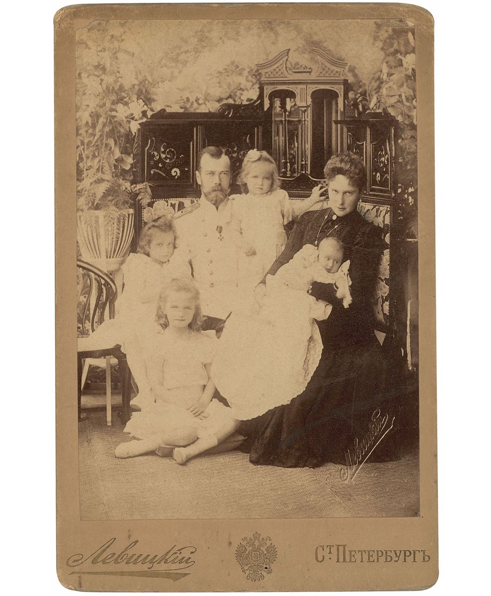 Charming original early 1900s Russian albumen cabinet card, 4.25 x 6.75, of the Romanov family. Lovely family portrait with a clean, if lightish, image. The front and back has the imprint of the 'Livitsky' portrait studio of Russia. The photo has general wear and aging, including edge wear and corner dings, light soiling and neat notes on back.
